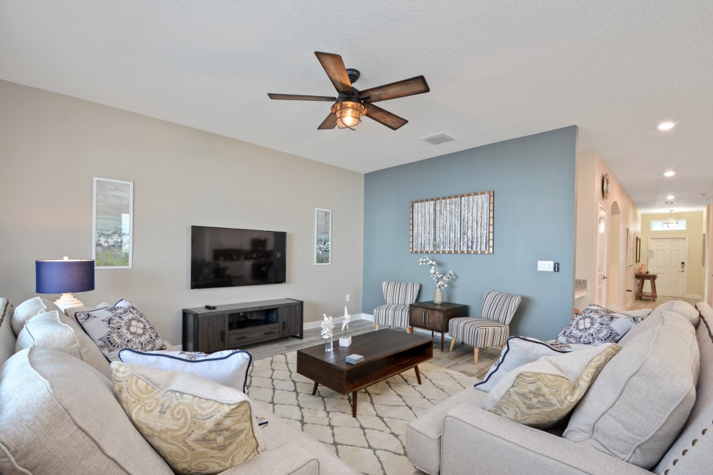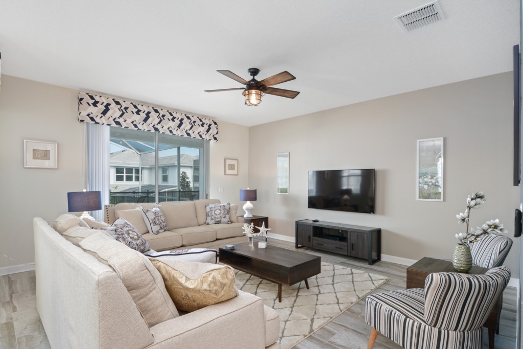 Spacious comfortable seating area with 2x sofas and 2x accent chairs overlooking the private pool deck through sliding glass doors