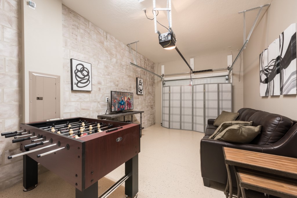 Games room has a large flat screen TV with a PS4 video game console, comfortable leather sofa, 2 seat high top table, and a foosball table