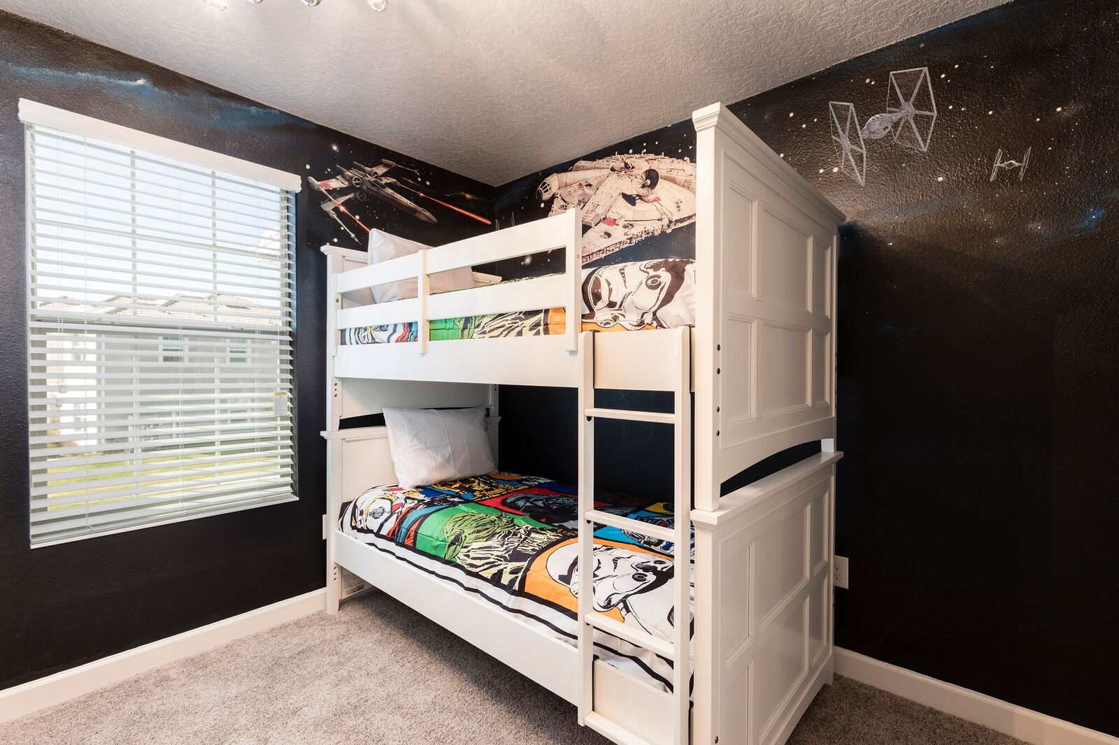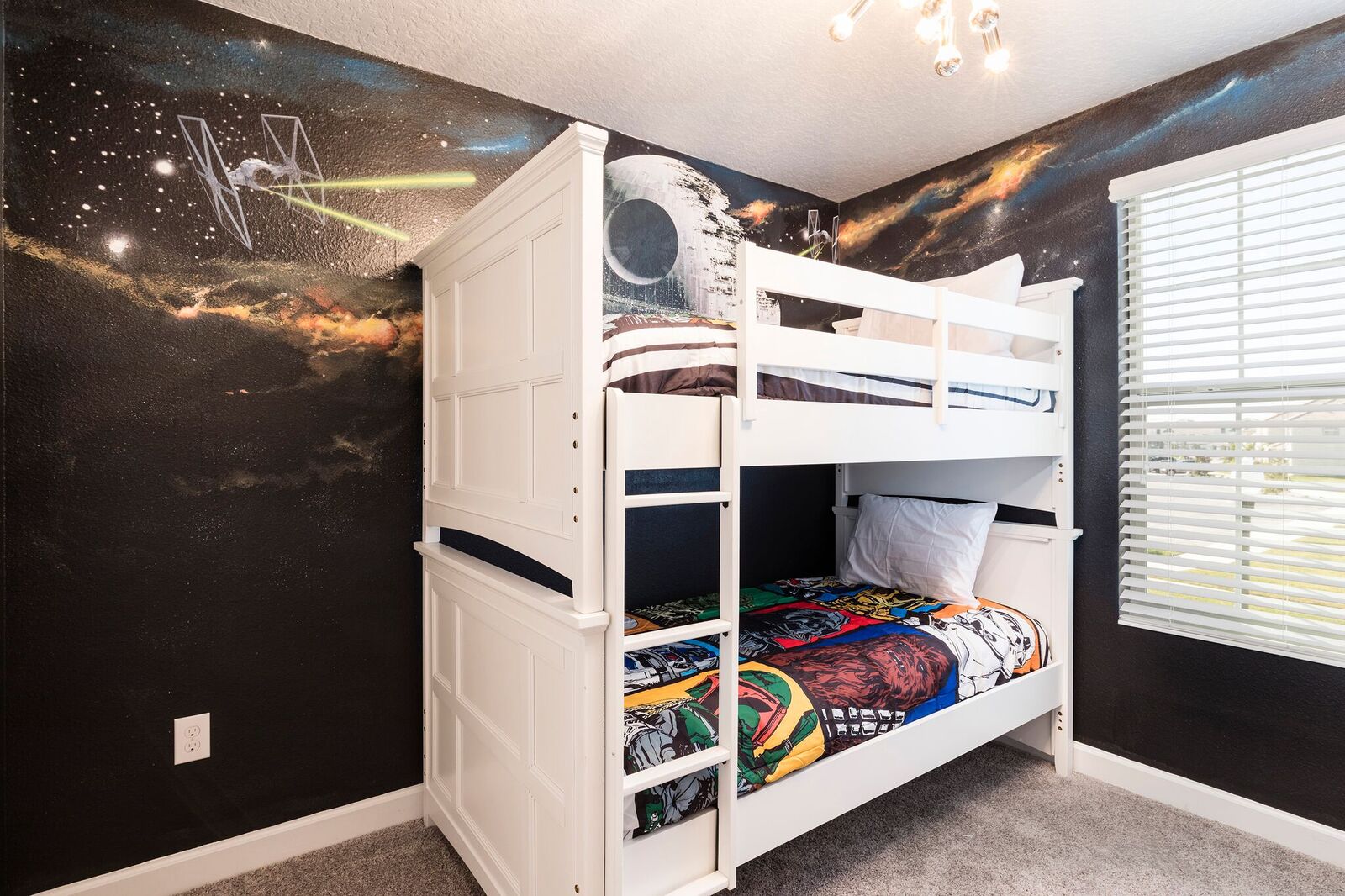 'Star Wars' themed bedroom with 2x set of bunk beds (4x Twin sized beds) and an en suite (shower/bath combo)