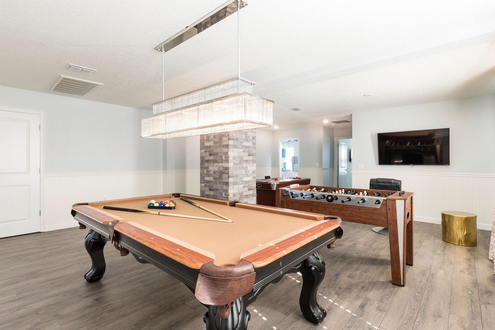 There is also an upper floor loft area equipped with a pool, air hockey, and foosball table for all your entertainment needs.