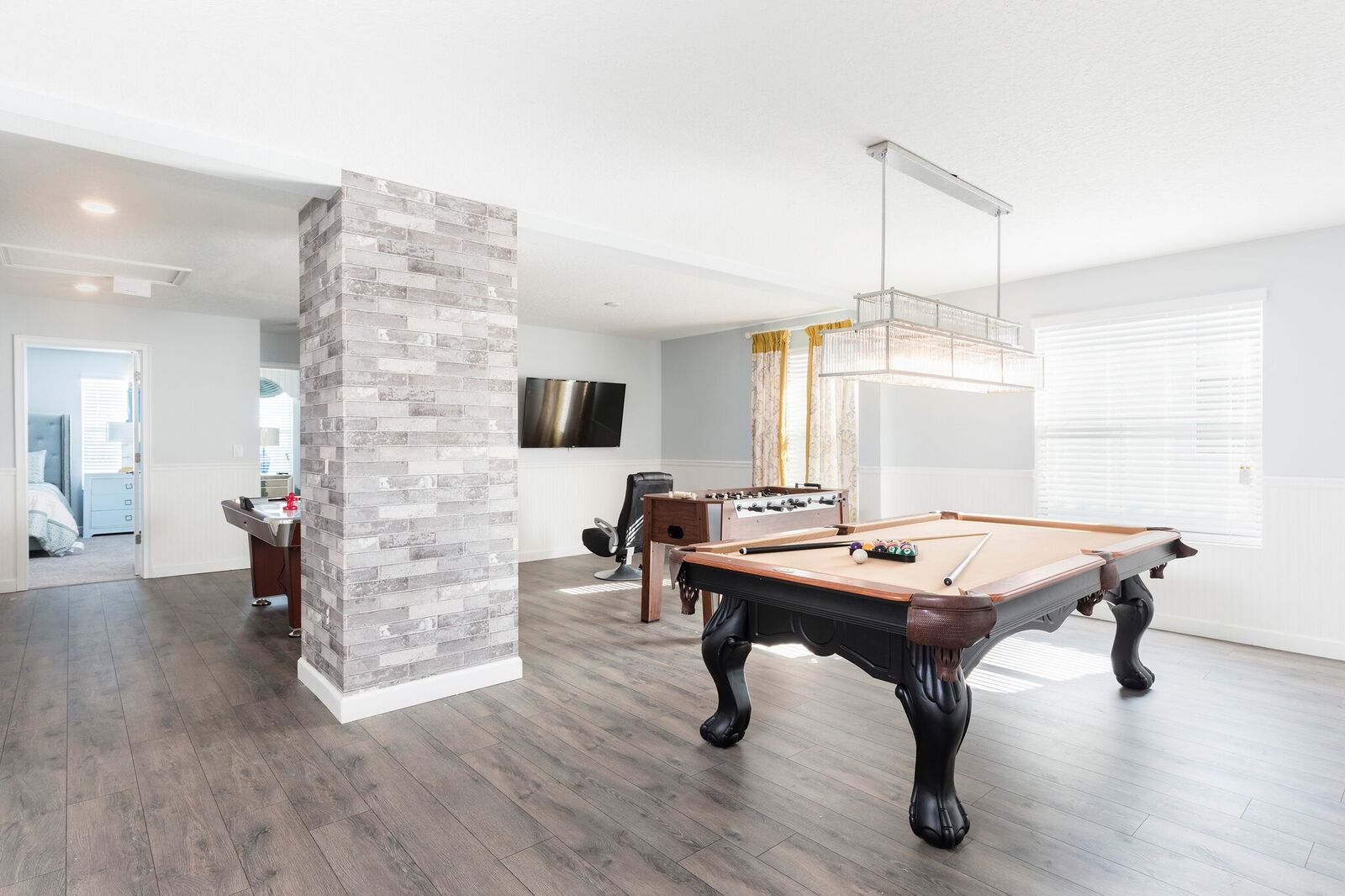 Upper floor loft area has a large flat screen TV, pool/ air hockey/ foosball table