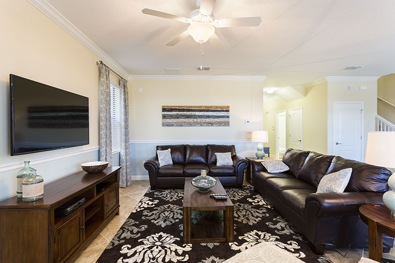 Spacious comfortable seating area with two leather sofas overlooking the pool deck
