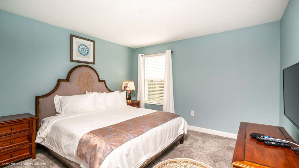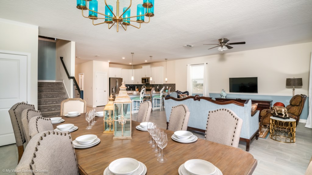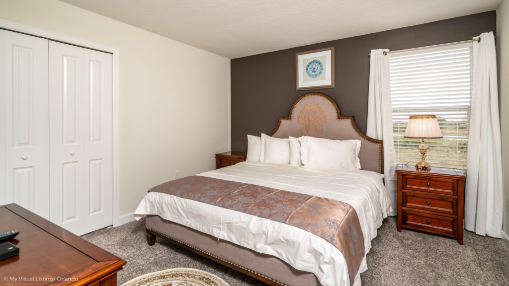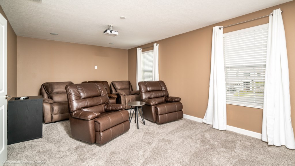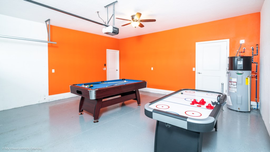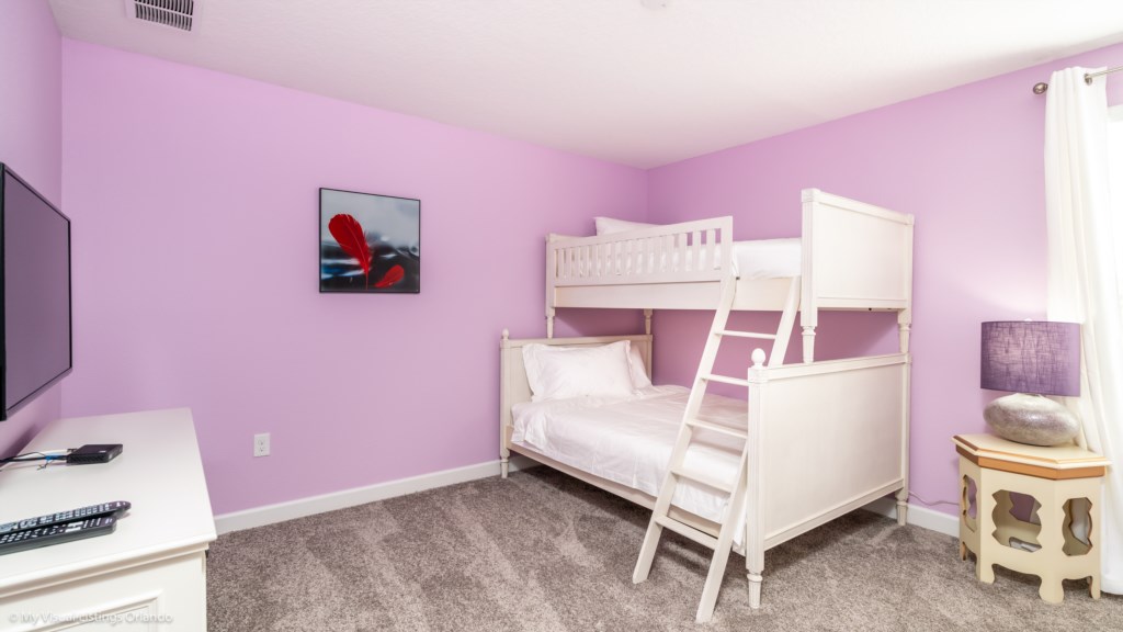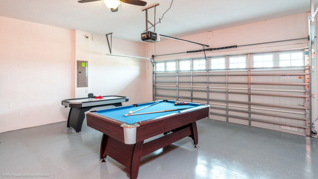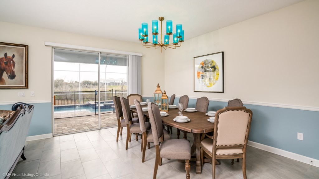 You will feel immediately relaxed as you enter our 8 bedroom, 5 bathroom executive home which sleeps up to 16 in style. We have paid great attention to every detail when we furnished this home and we hope you will enjoy it as much as we do with our own family. With 5 king bedrooms, 1 queen bedroom, 1 full bunk with twin below and 1 room with 2 twins , there is plenty of room for everyone to spread out and relax after a day out or just to stay in and take it easy. Each room has a different feel so all guests should be equally happy with their room, and all have wall mounted flat screen LED Tv’s. The dining room and living area offers plenty of space to congregate and enjoy meals together, and the bright and airy kitchen has all the appliances that you would expect in your own home. (There is also a full-size washer and dryer). You can also enjoy a game of pool in the game room, or watch a movie in the huge loft area, or leave the kids to play on the PlayStation. Or why not take a dip in the large pool or relax in the spa, even in the evening as the pool area is south facing? This home will bring all the excitement of Orlando to you, and have the entire group talking about your trip for months to come.