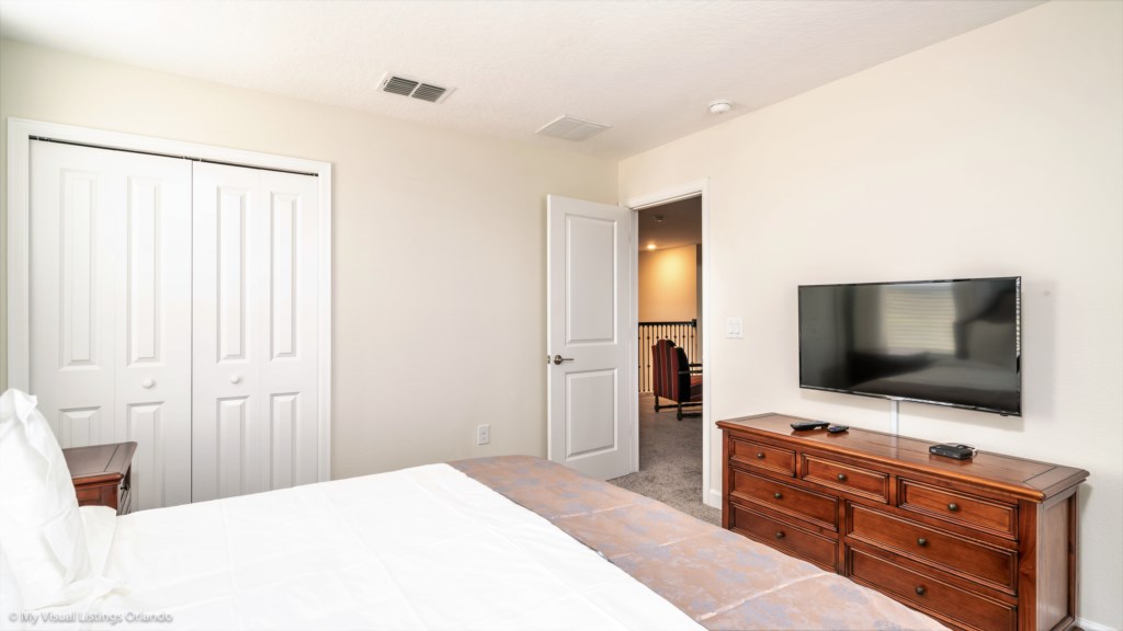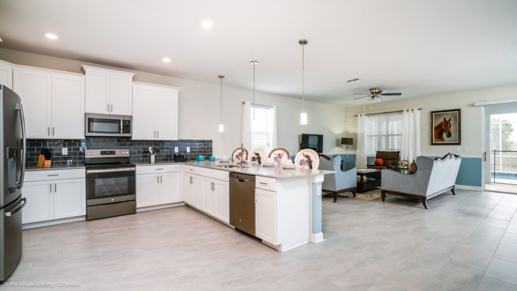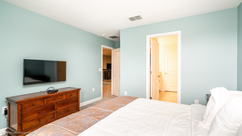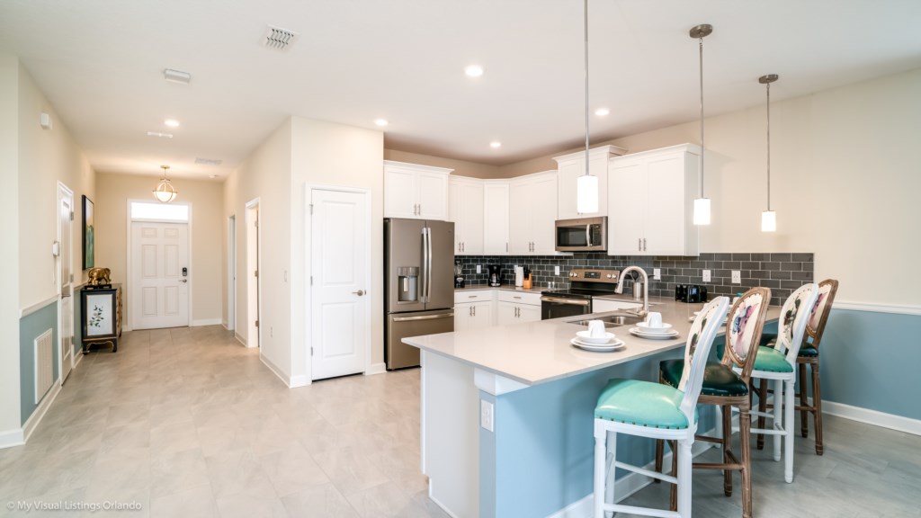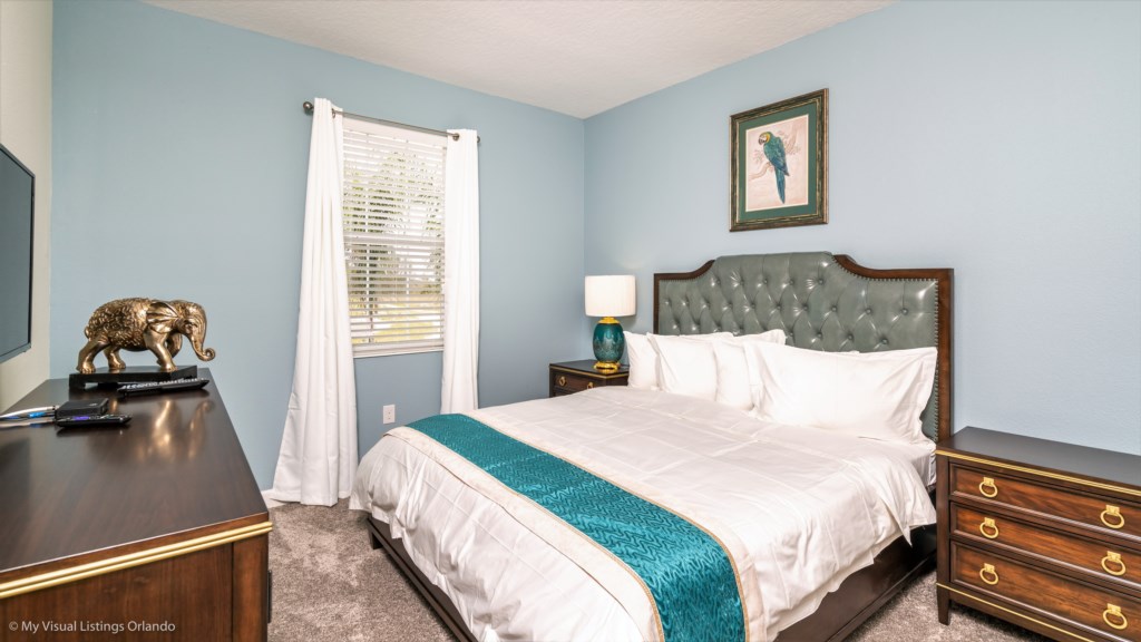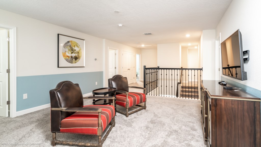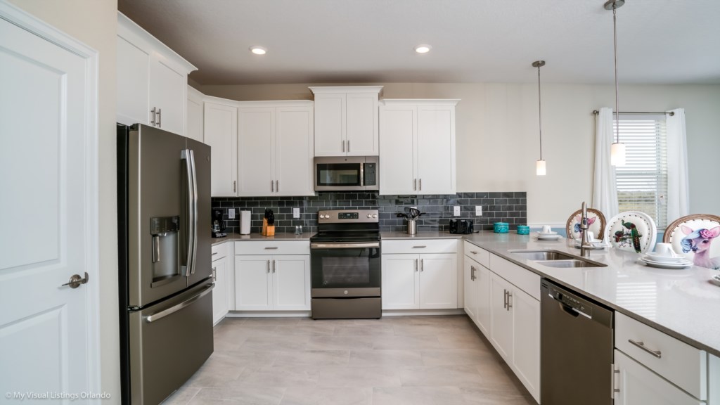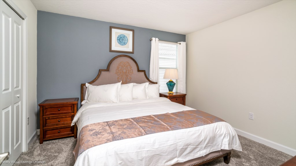 You will feel immediately relaxed as you enter our 8 bedroom, 5 bathroom executive home which sleeps up to 16 in style. We have paid great attention to every detail when we furnished this home and we hope you will enjoy it as much as we do with our own family. With 5 king bedrooms, 1 queen bedroom, 1 full bunk with twin below and 1 room with 2 twins , there is plenty of room for everyone to spread out and relax after a day out or just to stay in and take it easy. Each room has a different feel so all guests should be equally happy with their room, and all have wall mounted flat screen LED Tv’s. The dining room and living area offers plenty of space to congregate and enjoy meals together, and the bright and airy kitchen has all the appliances that you would expect in your own home. (There is also a full-size washer and dryer). You can also enjoy a game of pool in the game room, or watch a movie in the huge loft area, or leave the kids to play on the PlayStation. Or why not take a dip in the large pool or relax in the spa, even in the evening as the pool area is south facing? This home will bring all the excitement of Orlando to you, and have the entire group talking about your trip for months to come.