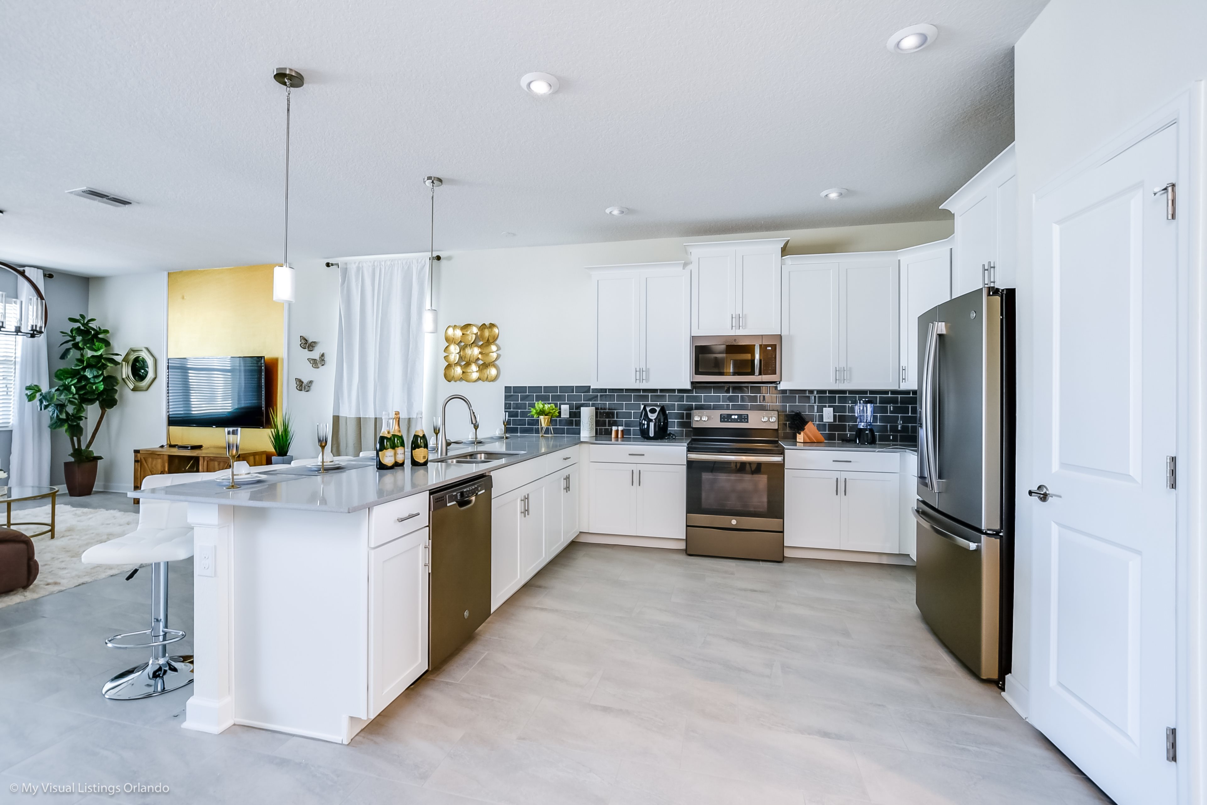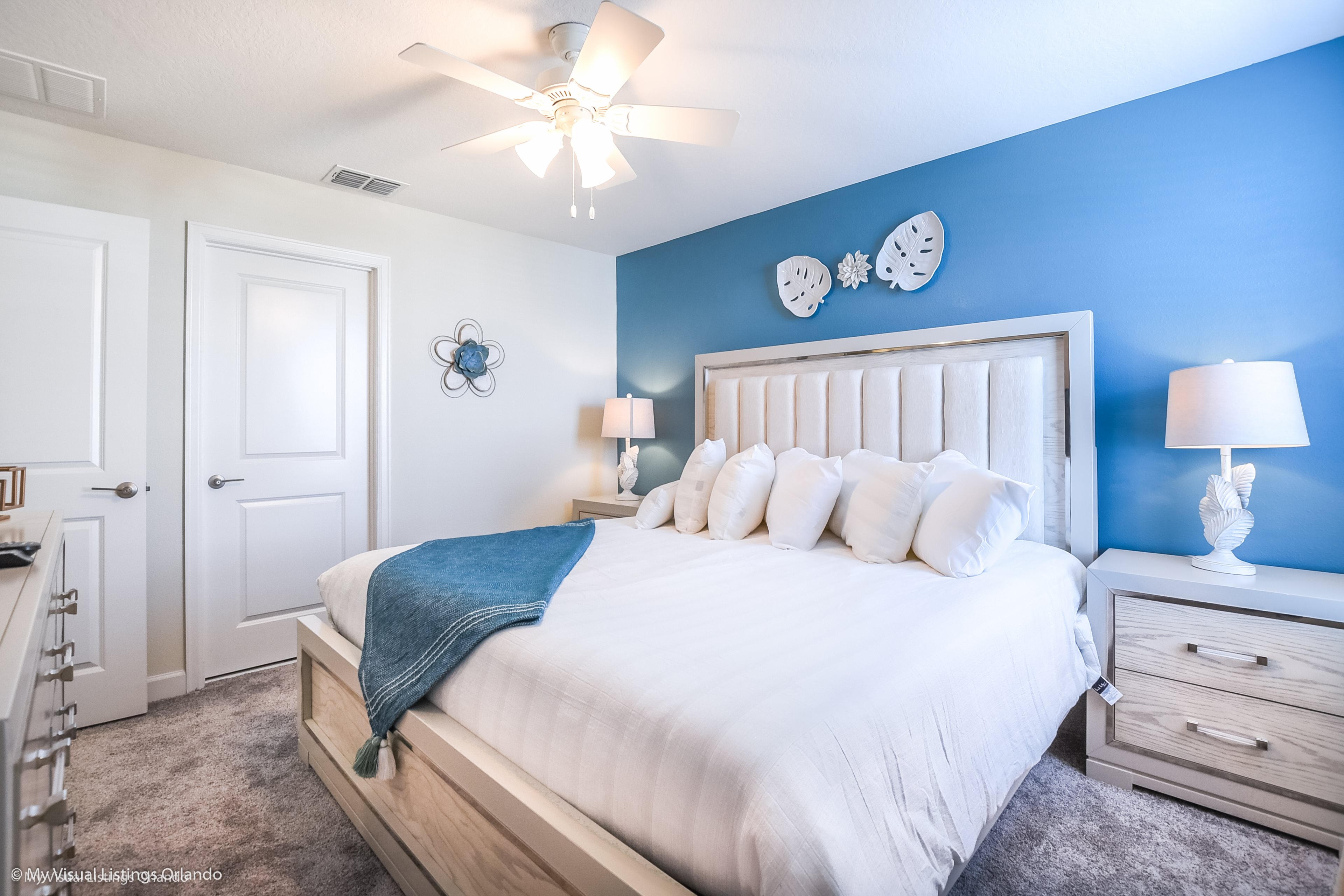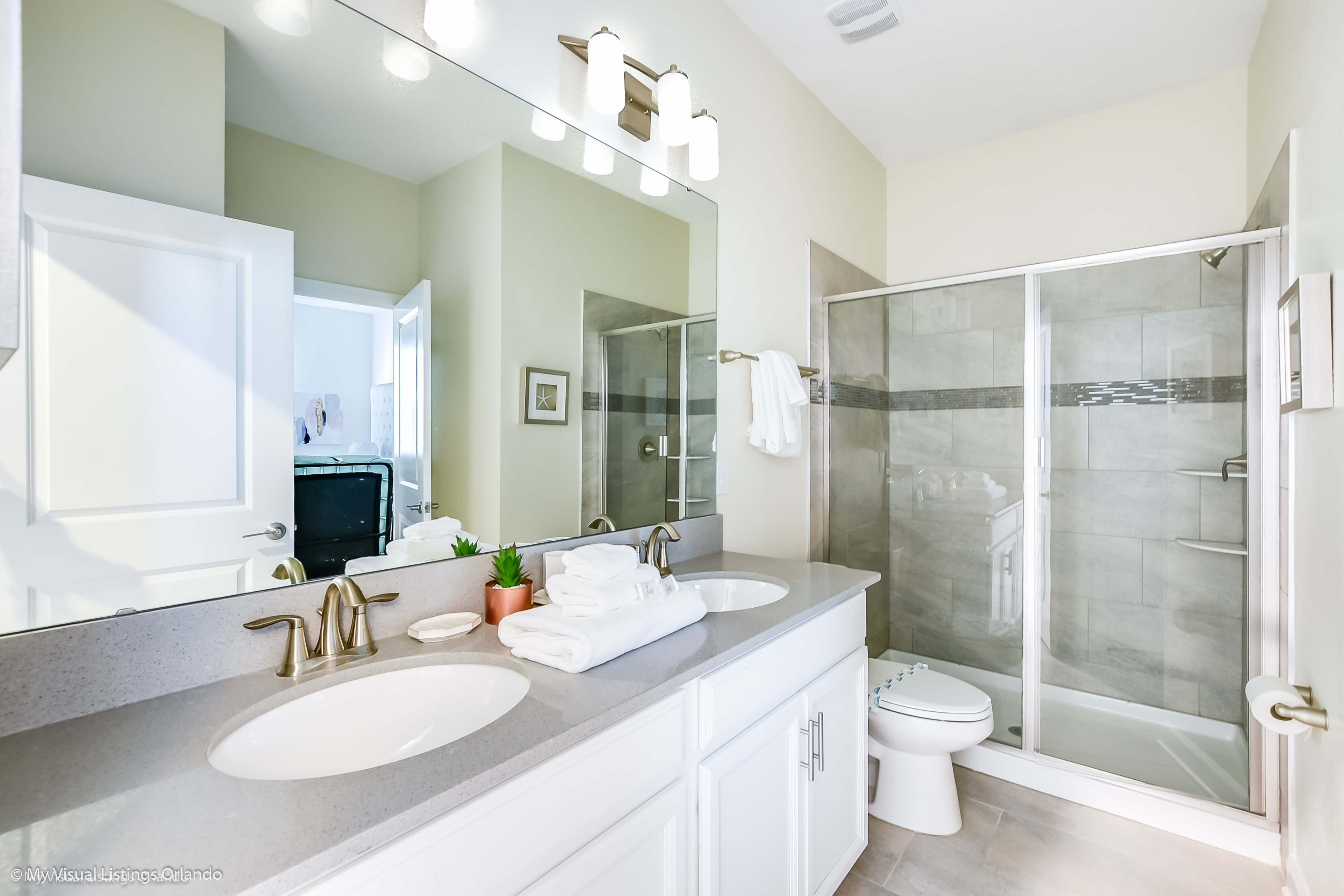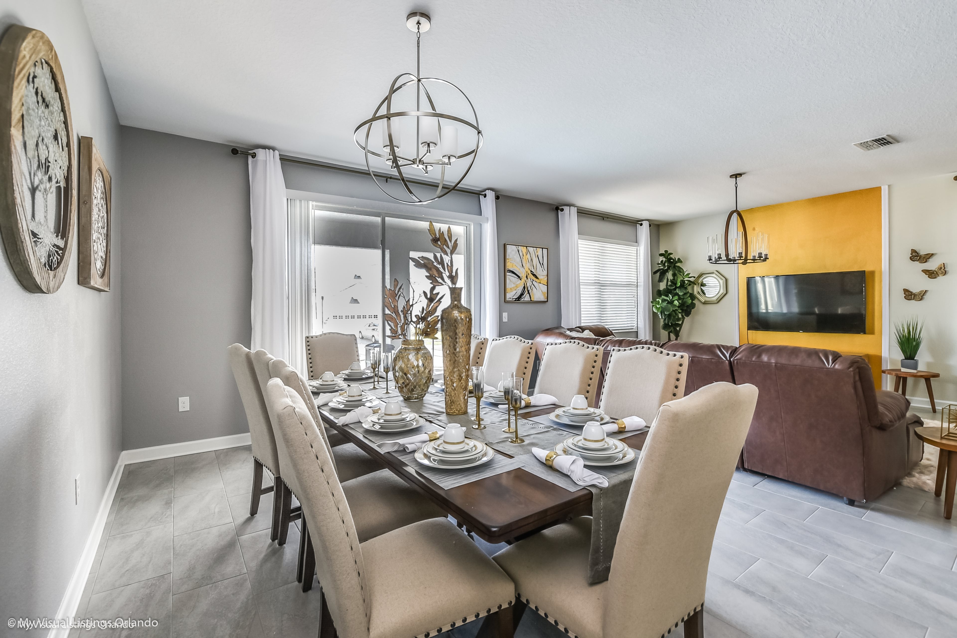 You will feel immediately relaxed as you enter our 8 bedroom, 5 bathroom executive home which sleeps up to 16 in style. We have paid great attention to every detail when we furnished this home and we hope you will enjoy it as much as we do with our own family. With 4 king bedrooms, 2 queen bedroom 2 twins rooms , there is plenty of room for everyone to spread out and relax after a day out or just to stay in and take it easy. Each room has a different feel so all guests should be equally happy with their room, and all have wall mounted flat screen LED Tv’s. The dining room and living area offers plenty of space to congregate and enjoy meals together, and the bright and airy kitchen has all the appliances that you would expect in your own home. (There is also a full-size washer and dryer). You can also enjoy a game of pool in the game room, or watch a movie in the huge loft area, or leave the kids to play on the PlayStation. Or why not take a dip in the large pool or relax in the spa, even in the evening as the pool area is south facing? This home will bring all the excitement of Orlando to you, and have the entire group talking about your trip for months to come.