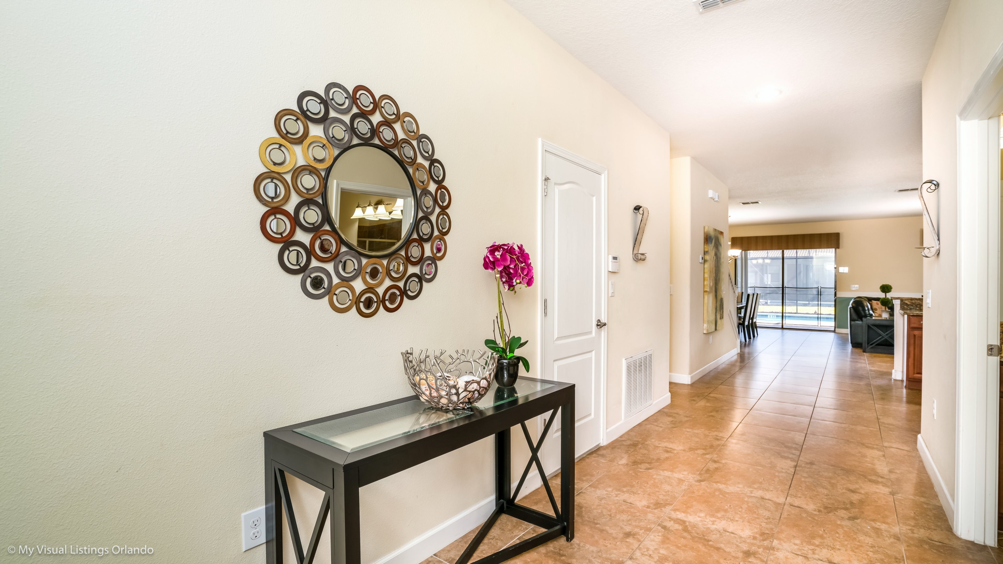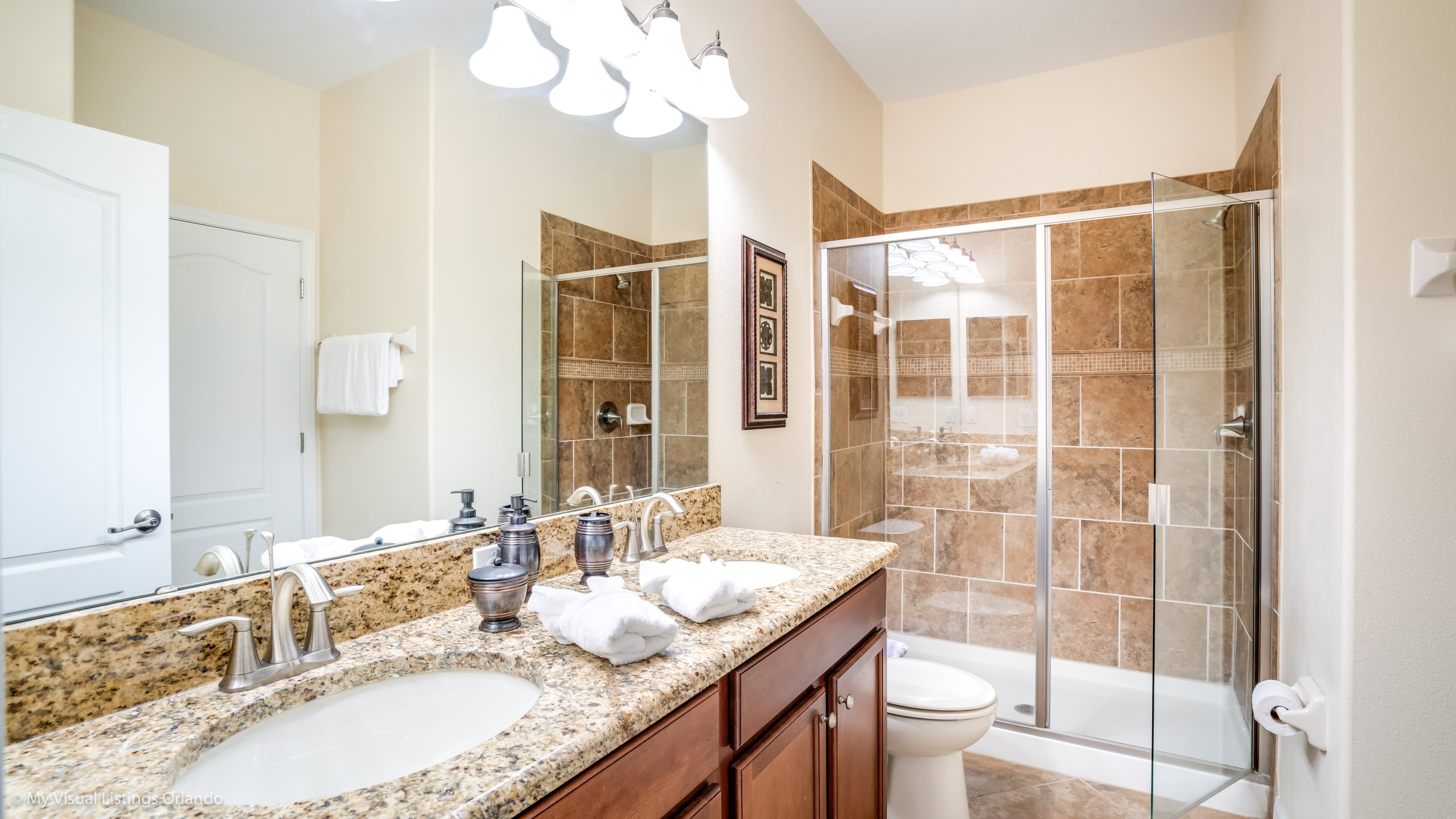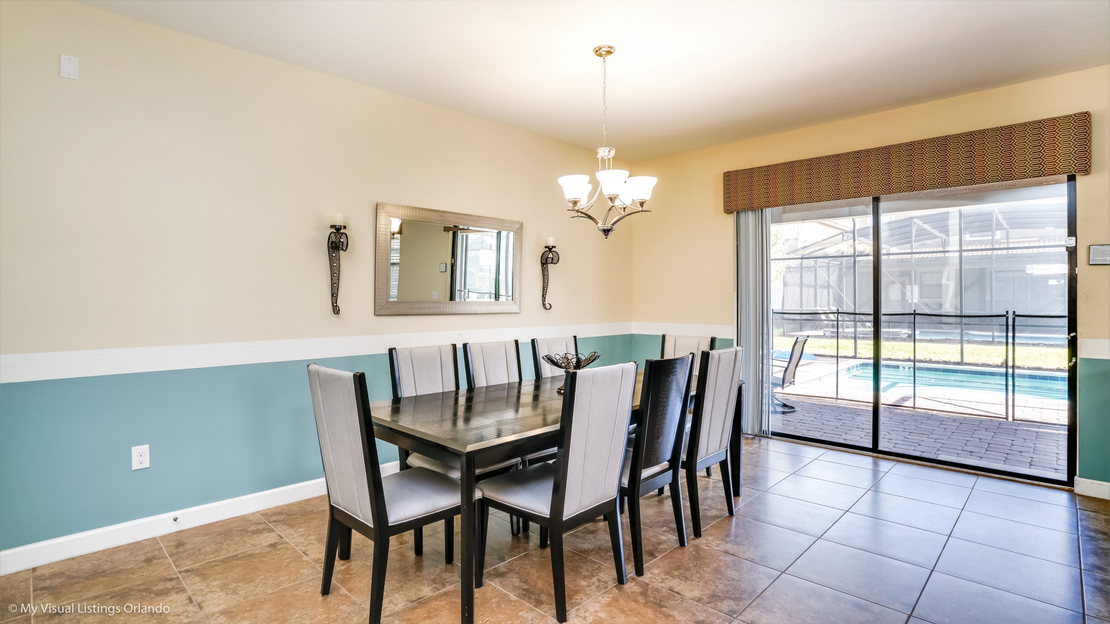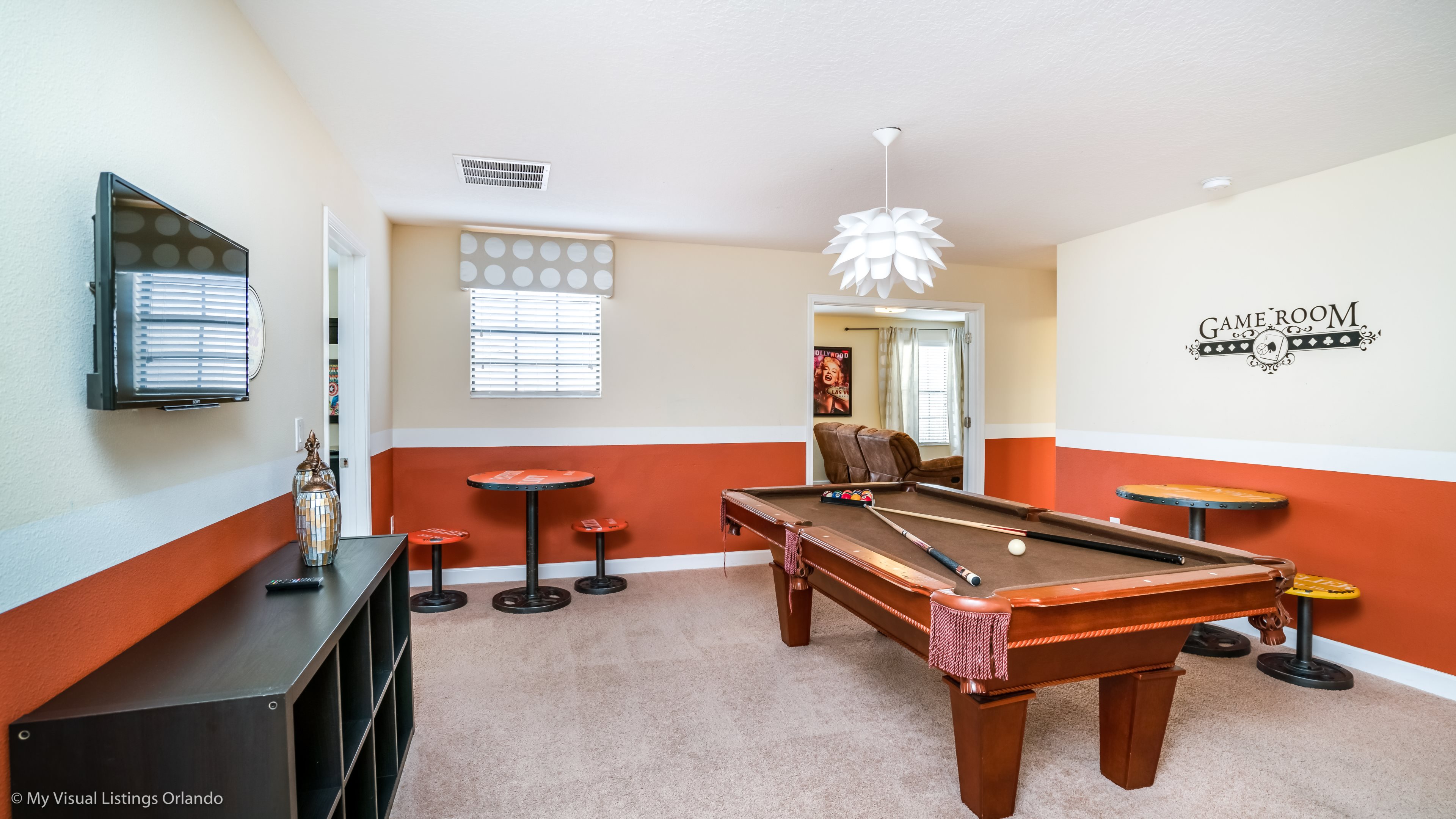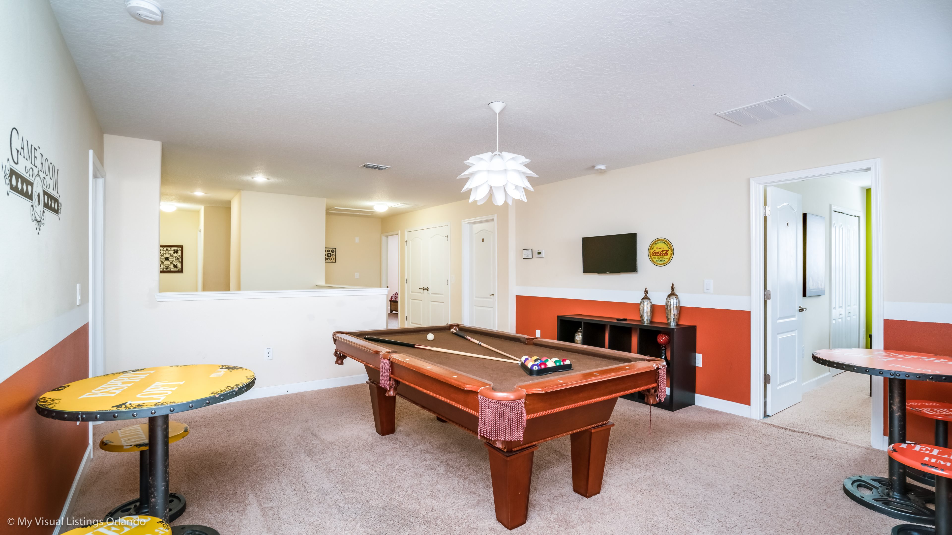You will feel immediately relaxed as you enter our 8 bedroom, 5 bathroom executive home which sleeps up to 16 in style. We have paid great attention to every detail when we furnished this home and we hope you will enjoy it as much as we do with our own family. With 4 king bedrooms, 2 queen bedroom 2 twins rooms , there is plenty of room for everyone to spread out and relax after a day out or just to stay in and take it easy. Each room has a different feel so all guests should be equally happy with their room, and all have wall mounted flat screen LED Tv’s. The dining room and living area offers plenty of space to congregate and enjoy meals together, and the bright and airy kitchen has all the appliances that you would expect in your own home. (There is also a full-size washer and dryer). You can also enjoy a game of pool in the game room, or watch a movie in the huge loft area, or leave the kids to play on the PlayStation. Or why not take a dip in the large pool or relax in the spa, even in the evening as the pool area is south facing? This home will bring all the excitement of Orlando to you, and have the entire group talking about your trip for months to come.