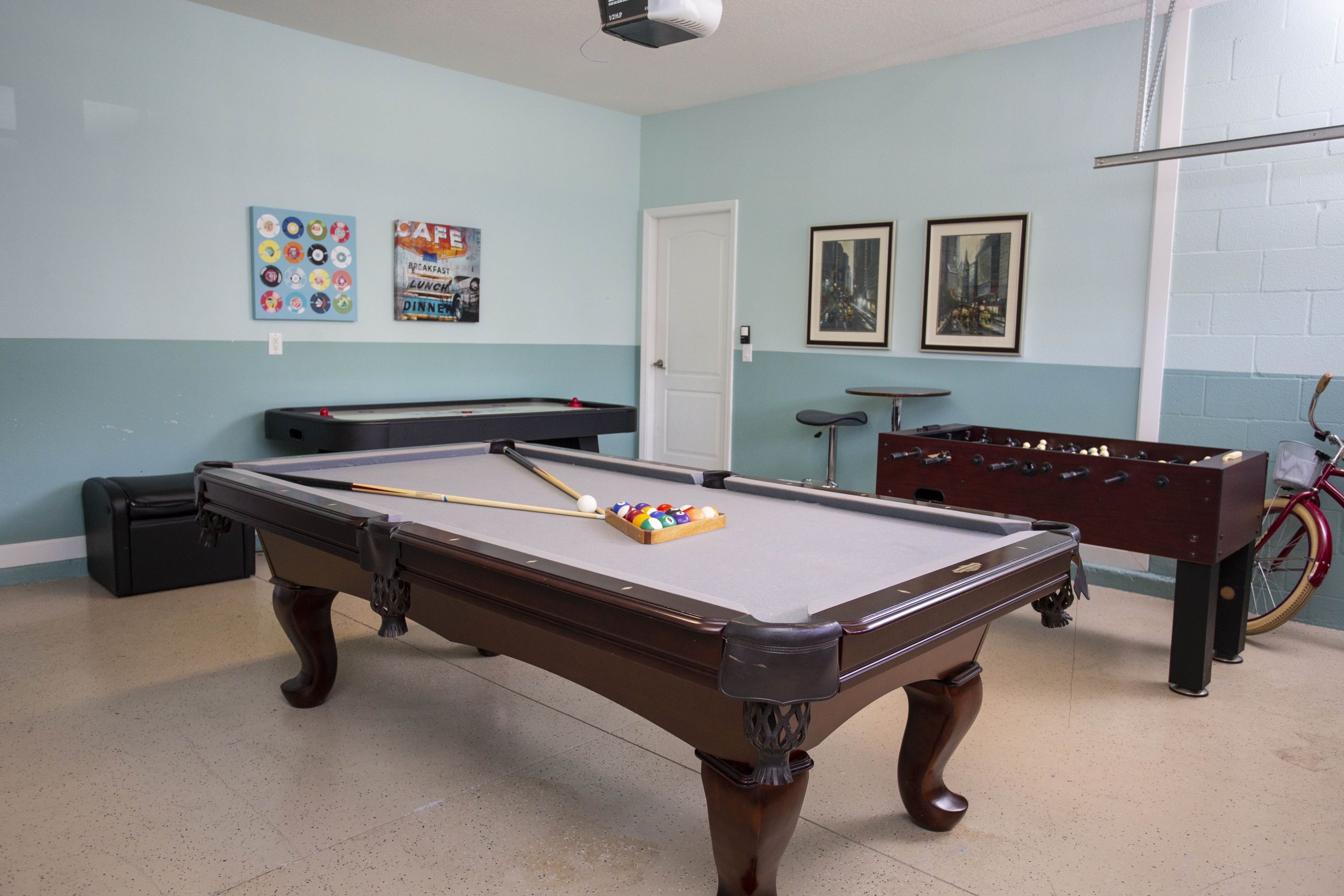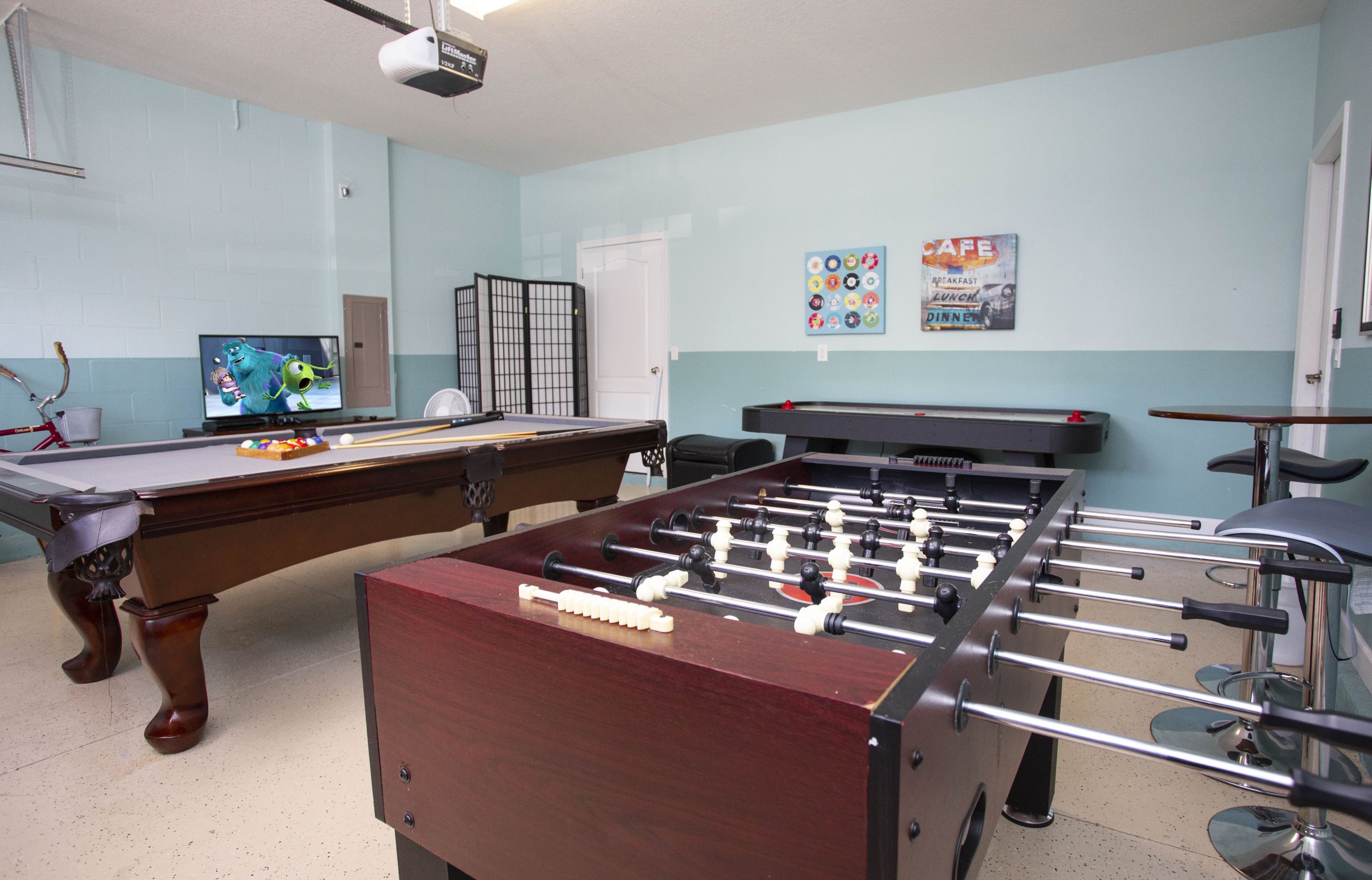 Games room has an air hockey, pool, and foosball table, flat screen TV with Playstation video game console, 2x seat high top table