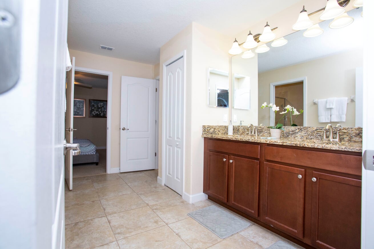 King sized bedroom with en suite/family bathroom (Jack/Jill style-shower, twin vanities) connecting to a bedroom with a Full and Twin sized bed