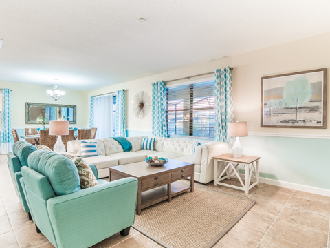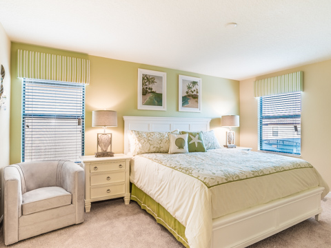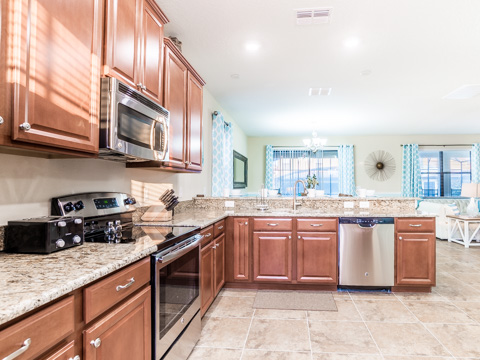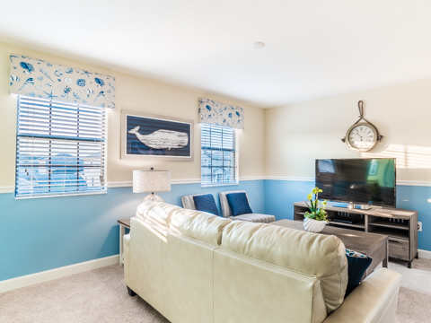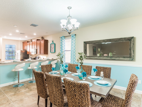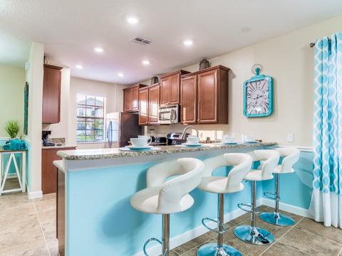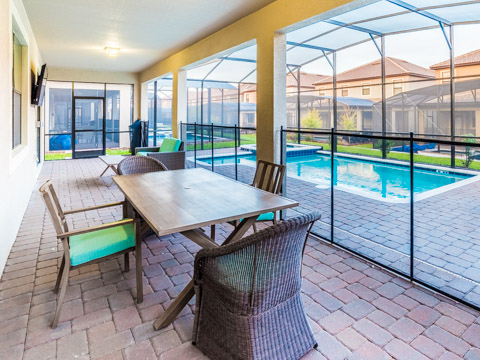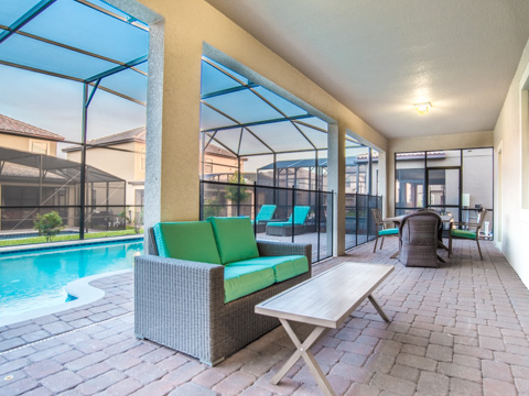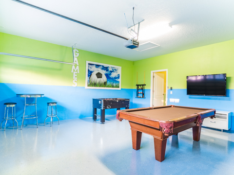 This fabulous 5 bedroom, 4.5 bathroom vacation rental is located in ChampionsGate, the premier Orlando/Kissimmee resort community featuring the spectacular Oasis clubhouse. As you enter, you will find everything that will make for a perfect holiday. To start with, the home is professionally decorated, with special touches throughout. When choosing to dine in, the fully furnished kitchen, with stainless steel appliances, granite counter tops and upgraded cabinetry, will meet all of your culinary needs. Along with plenty of seating at the dining room table, the kitchen bar has seating as well. The game room is ideal for spending hours together playing billiards and foosball and watching sports on the huge flat screen TV. Each bedroom as its own flat screen and there’s ample bathrooms so everyone has their own space and privacy. The bedroom configurations feature 2 king bedrooms, 1 queen bedroom and 2 twin bedrooms. The outside pool area is fantastic and features a refreshing pool and relaxing spa, an impressive flat screen TV, plenty of padded sun loungers, a couch and a large table and chairs for poolside dining. A washer and dryer is available for your convenience as well free WIFI.