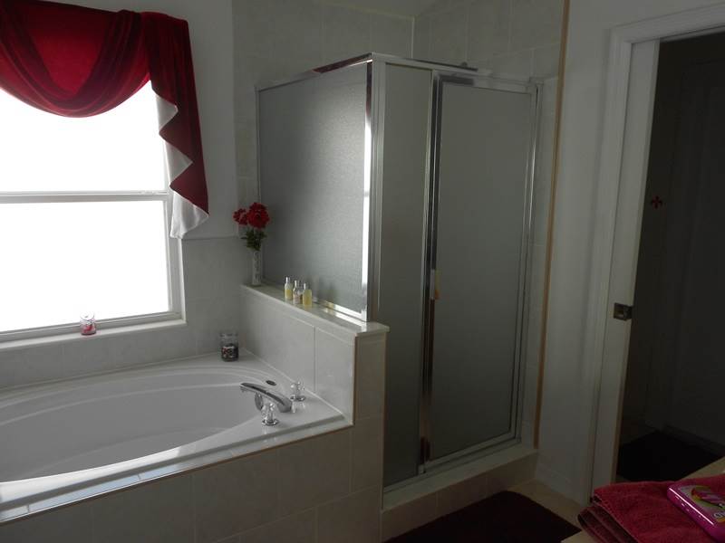 The master bedroom, that has a huge 7 feet wide bed, is en-suite with both shower and bath. There is a large walk in wardrobe and a door leading onto the pool area. A TV is provided for your convenience.