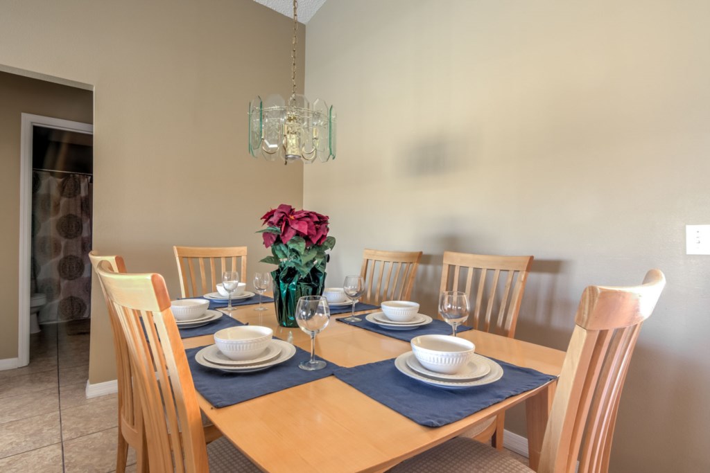 The large living room has gold-colored walls, 2 larges sofas, and an arm chair. The kitchen is a decent and comes full equipped with all the equipment and utensils you could need to prepare any meal. It also has modern appliances, a good amount of countertop space, and a small breakfast nook with seating for up to 4. This is the perfect place to sit down and have a quick bite to eat. If you need a little more space than what the breakfast nook provides, why not eat in the formal dining area. Here, there is seating for up to 6 at the large, rectangular dining table.