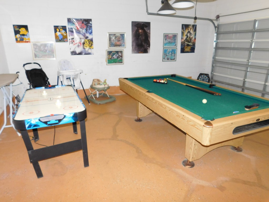 In the garage there is a games room with a pool table and air hockey table with baby high chair(s). In the kitchen there is a refrigrator, stove, oven, coffee maker, kettle, and microwave. Additionally all plates and eating utensils are provided for, so are all linens and towels.