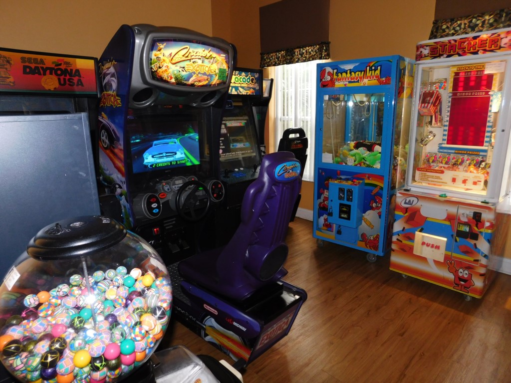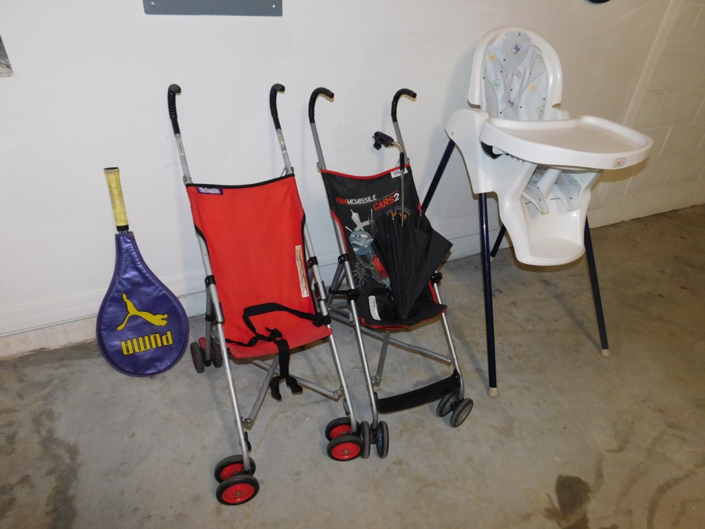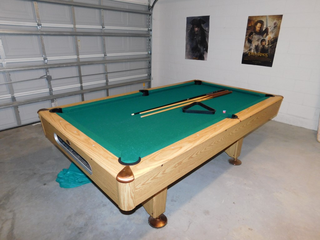 In the garage there is an air hockey table, and pool table along with a stroller and baby chair.
