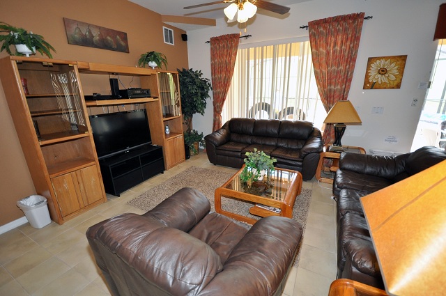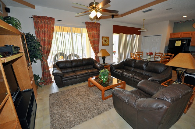 Adjacent to the kitchen is the larger of the two family rooms furnished with comfortable leather sofas, tables, lamps large flat screen HDTV and DVD player which is further complimented with a surround sound system!
