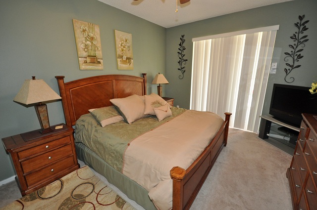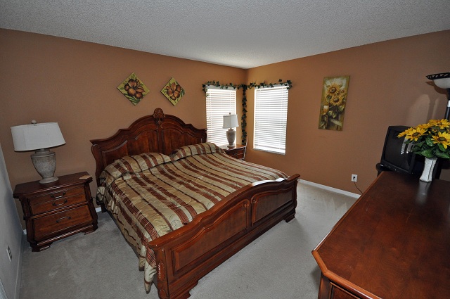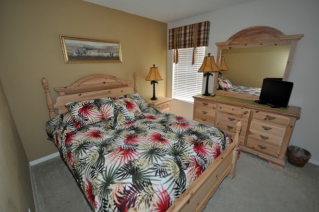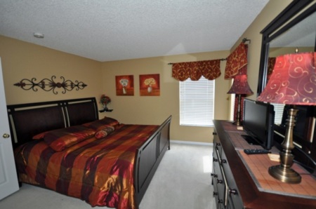 Also on this level is the first of the King master bedroom suites, furnished with a King size bed, nightstands, lamps, clock, ceiling fan flat screen HDTV and dresser