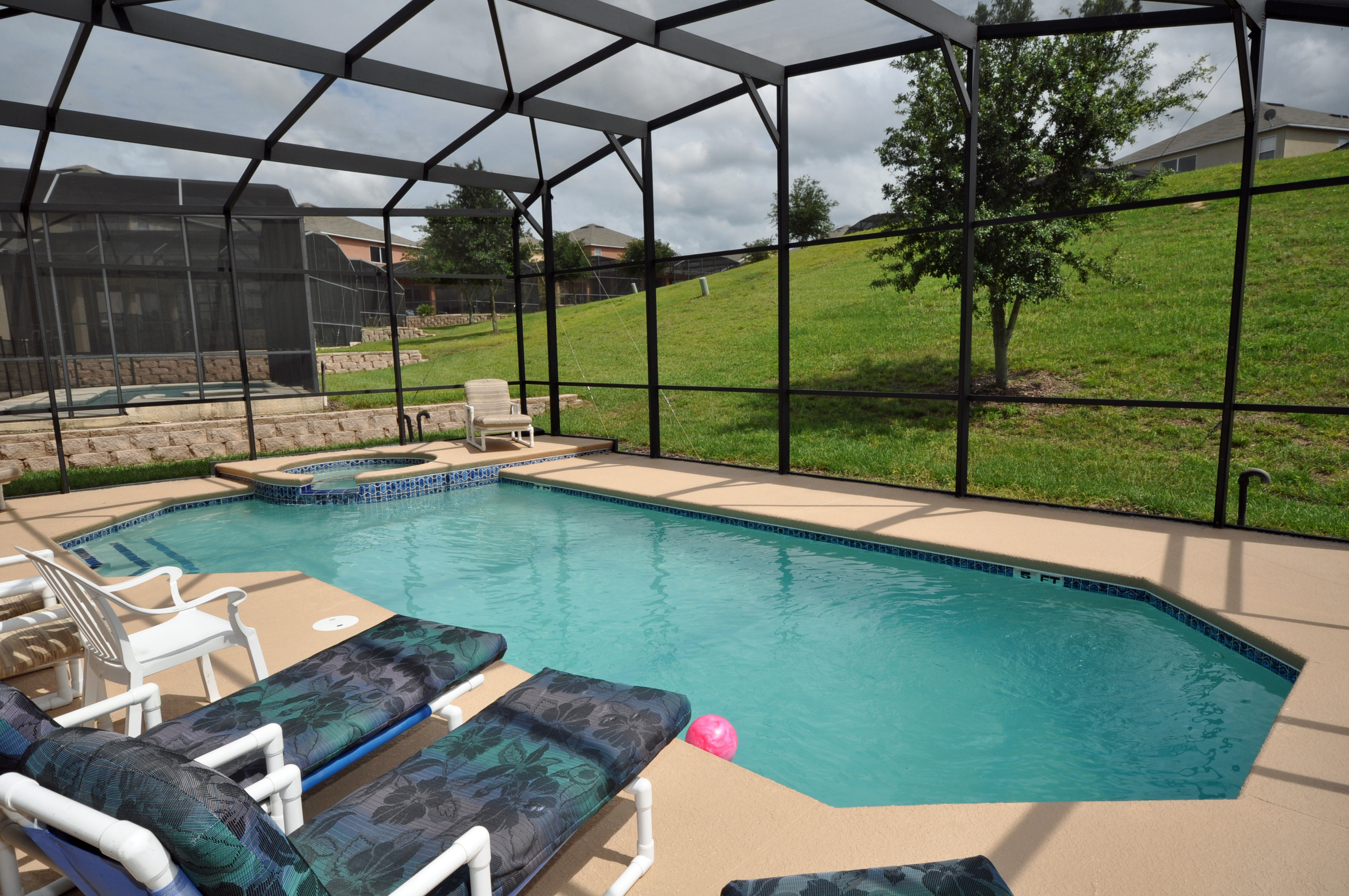 Ok, back downstairs and lets take a look outside at your own private South facing pool deck. There is ample patio furniture with tables chairs and sun loungers, a child safety fence (can easily be stowed for adult groups) The large lanai (under cover) area is perfect to enjoy the Florida outdoors. The pool deck area is just perfect for you sun lovers as it has a Southerly aspect and gets the maximum exposure to the sun. Cool off in the sparkling pool and just sit in the bubbling spa and ease all those worries away!