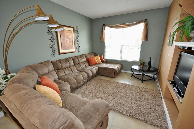 The first room as you enter the home is the first and smaller of the two family sitting rooms. This room has a huge wrap round family sofa and large HDTV and DVD player.