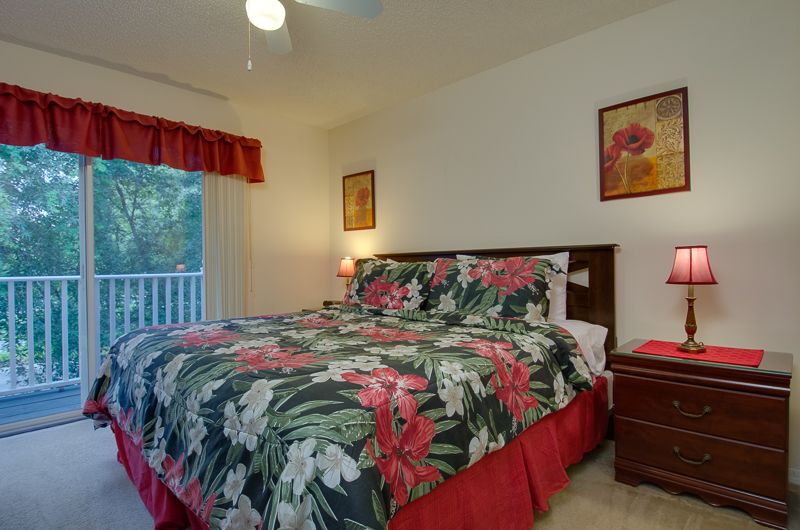 Upstairs are the 3 bedrooms en suite master bathroom and a family bathroom. The master suite has a king size bed, nightstands, clock, lamps, dresser, built in closet, large screen tv. This bedroom has a small private balcony with a pleasant outlook over trees to the tennis courts, bar b q area and garden below.There is a full master en suite private bathroom consisting of sink, wc and large walk in shower. Bedroom 2 has a queen size bed, built in closet, tv, dresser night stand and lamp, bedroom 3 has a set of bunks with a twin bed on top and a full on the bottom, built in closet and drawer space, tv.