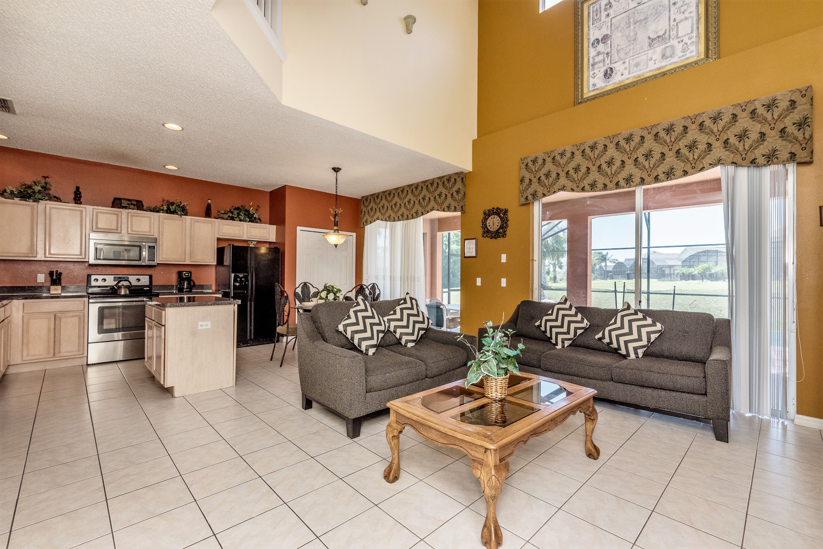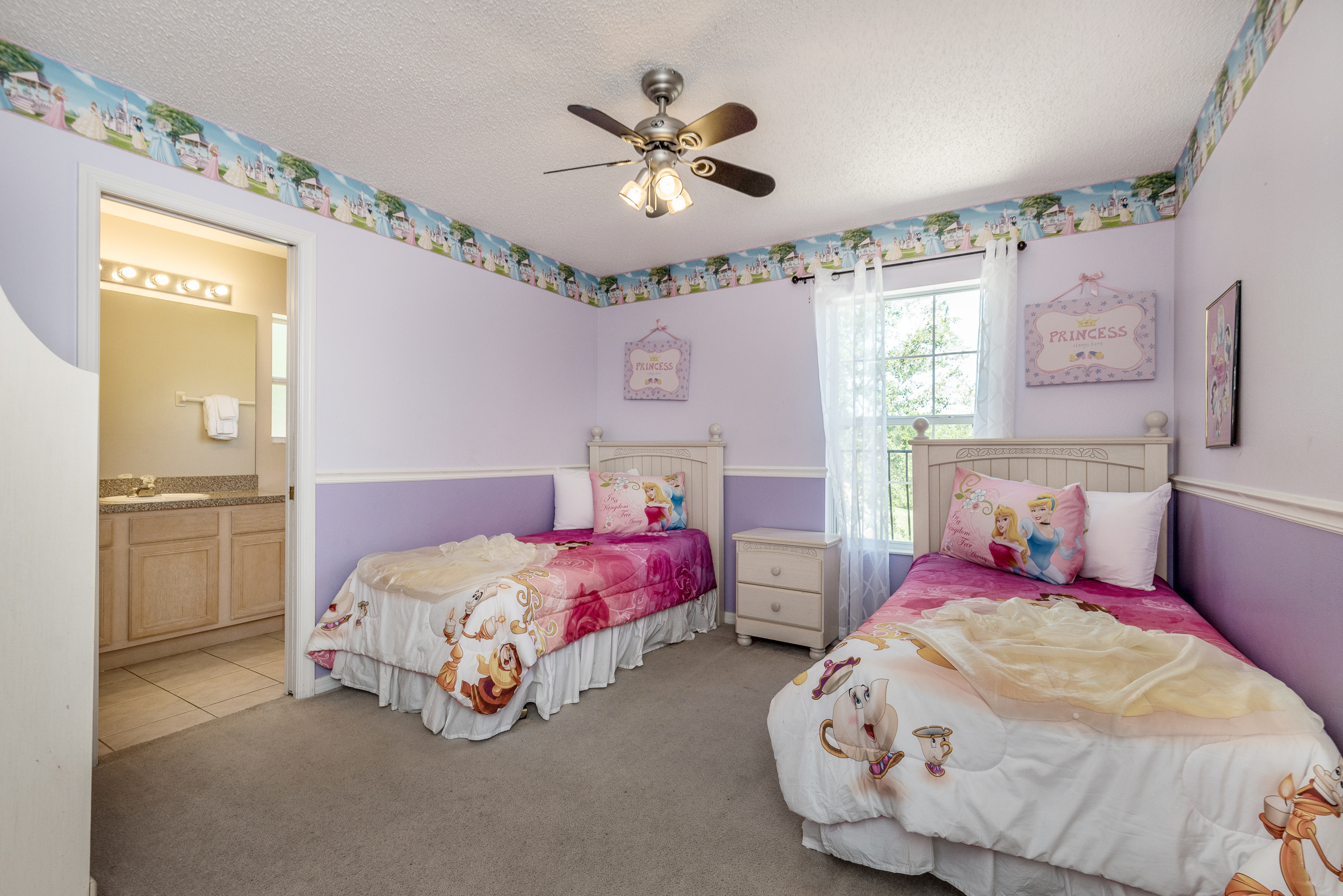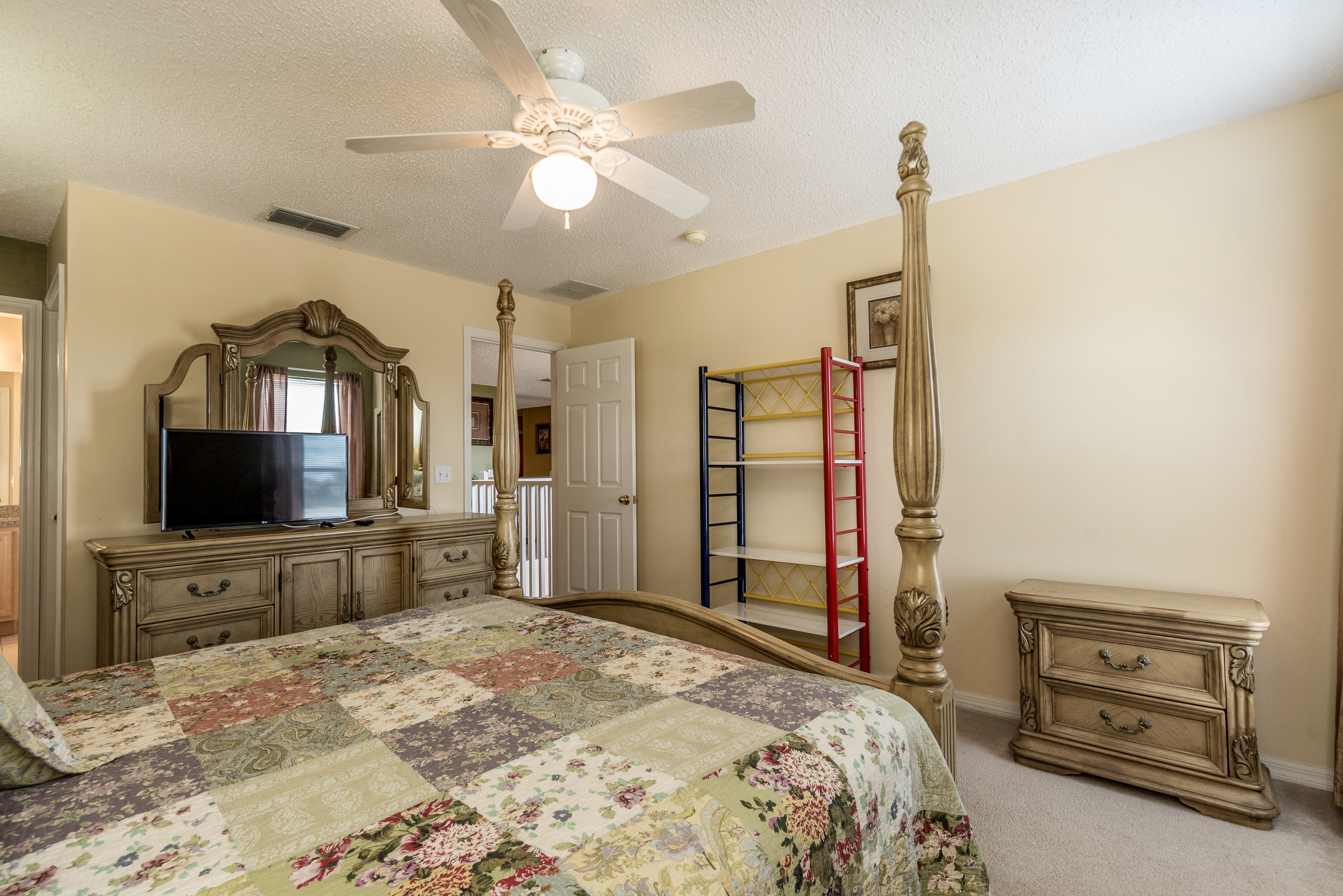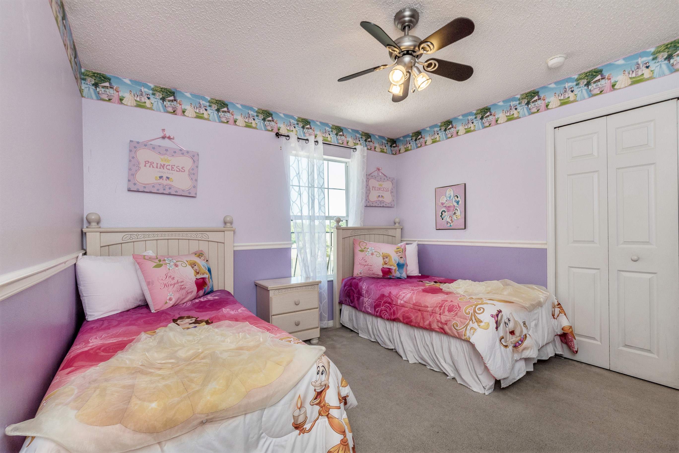 This lovely 7 BEDROOMS/5.5 BATHROOM home backs to a dry pond!! Located in guard gated Emerald Island Resort. Three MASTER BEDROOMS, high ceilings, storage galore, PLUS private pool and spa! The spacious kitchen overlooks a family room perfect for entertaining your group! This home has plenty of bedrooms for 1 large family or multiple families vacationing together. There is a master bedroom and private master bathroom suite downstairs with private French Doors that lead to the outdoor lanai and pool/deck area. Upstairs has a total of 6 bedrooms consisting of 2 wings with 2 master bedrooms, secondary bedrooms sharing Jack and Jill bathrooms, with an amazing breezeway that overlooks downstairs living area. Nice open back yard view from the pool area, sun in the pool all day long. 3 miles from Disney World and all things Florida! Near shopping, dining and entertainment.