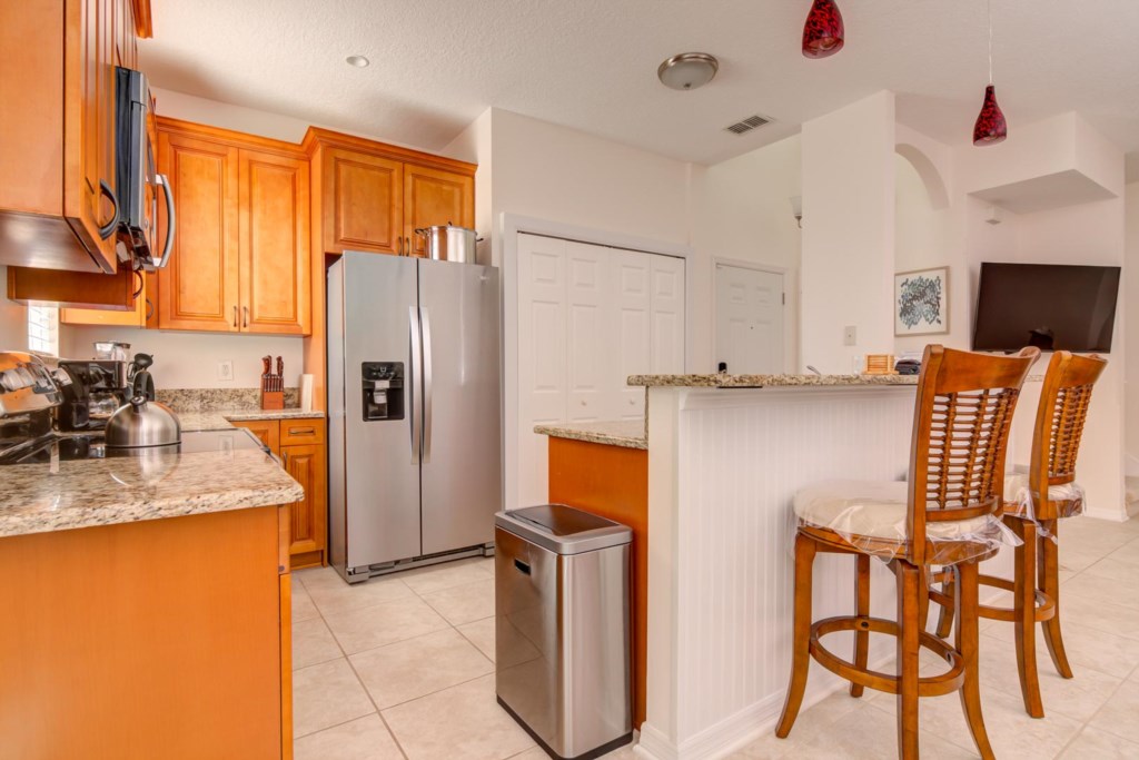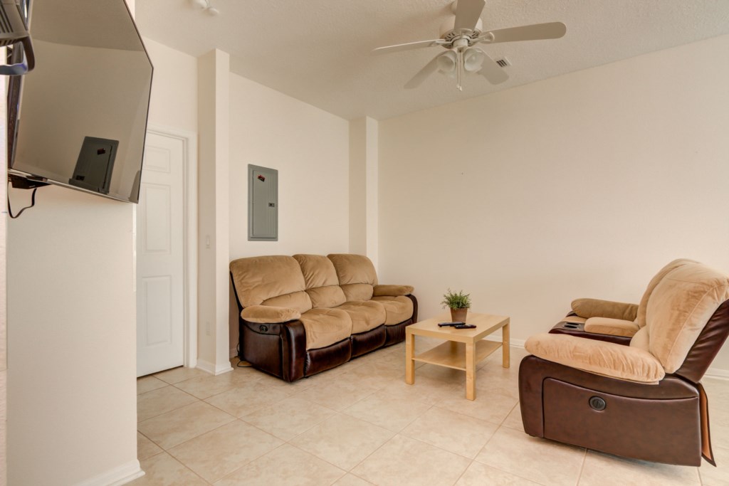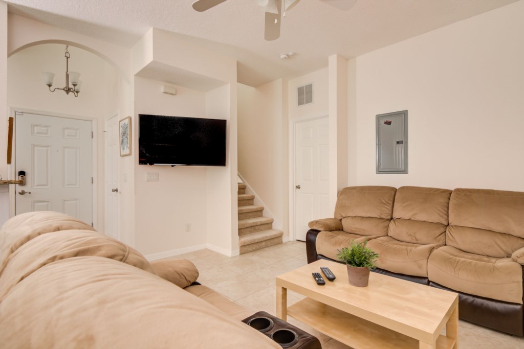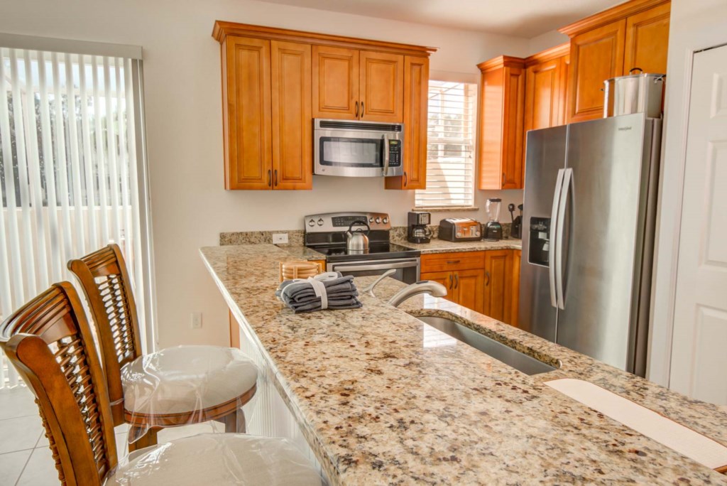 This townhouse is located right next to the clubhouse. The fully-equipped kitchen will please anyone wanting to stay in and cook a meal. It has plenty of countertop space, granite countertops, stainless steel appliances, and a breakfast bar with seating for two. If you need a little more seating when you dine, there is a small dining area with a rectangular table that seats up to 6. The living room has a two-seater recliner and a 3-person sofa. There is also a large flat screen TV mounted to the wall for your entertainment.