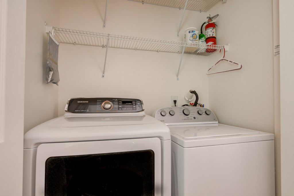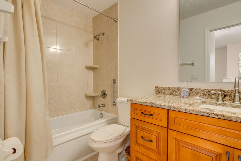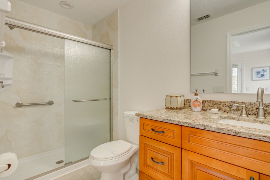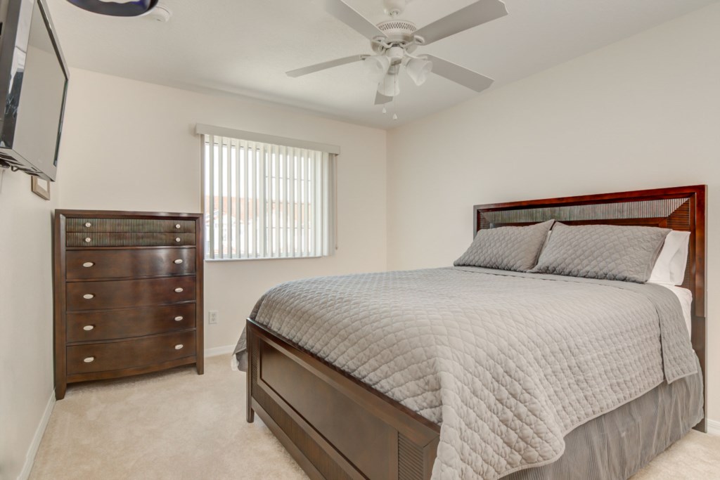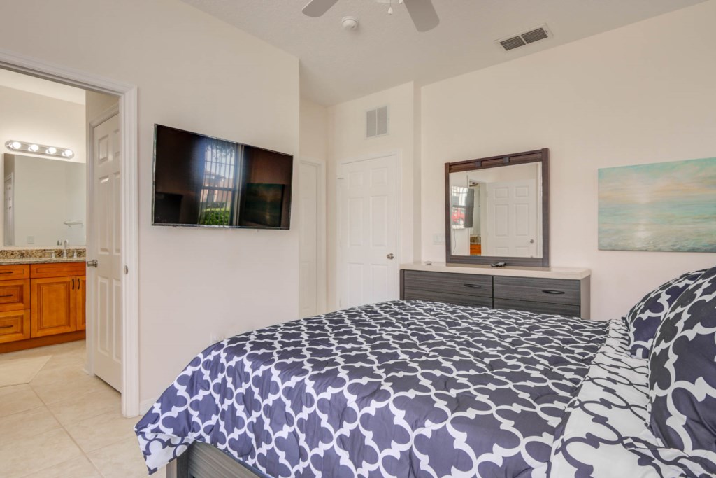This townhouse is located right next to the clubhouse. The fully-equipped kitchen will please anyone wanting to stay in and cook a meal. It has plenty of countertop space, granite countertops, stainless steel appliances, and a breakfast bar with seating for two. If you need a little more seating when you dine, there is a small dining area with a rectangular table that seats up to 6. The living room has a two-seater recliner and a 3-person sofa. There is also a large flat screen TV mounted to the wall for your entertainment.