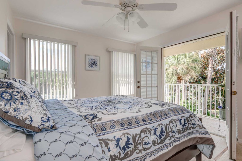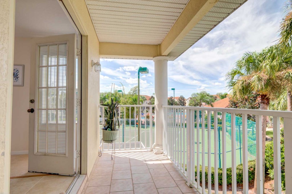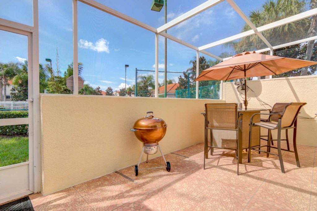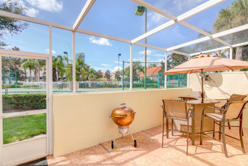 Downstairs, located off of the dining area, there is a private screened-in porch. Here, there is a bar table with umbrella and two chairs as well as a copper-style charcoal grill. There is a screen door from the patio that leads out to the tennis court and the rest of the community amenities.