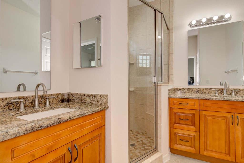 There are four bedrooms. The first bedroom, the master bedroom, is downstairs, and it has a queen-size bed, flat screen TV, and an en-suite bathroom with dual vanities and walk-in shower. Upstairs is the bedroom two, which has a queen-size bed and, flat screen TV, a private balcony, and an en-suite bathroom. Bedrooms three and four also have queen-size beds and flat screen TVs.
