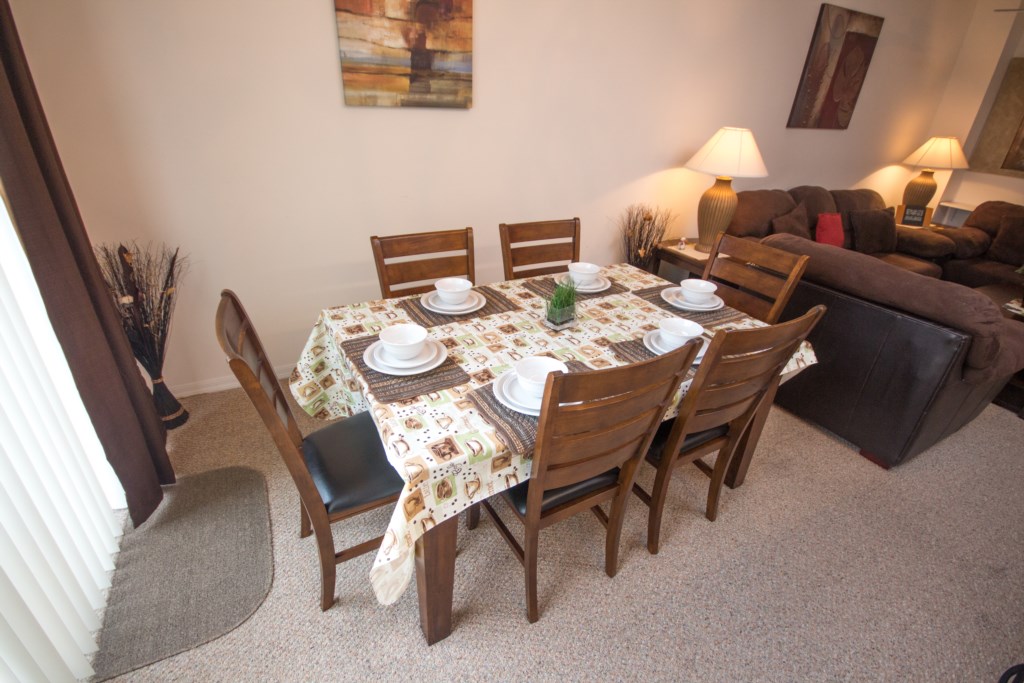 The downstairs area of this townhouse has an open plan layout which provides a spacious area in which to live. The dining room has a beautifully crafted wooden table with a stunning chandelier, adding to the intimacy. A smaller breakfast nook has been placed next to a large window which makes for a great place to eat breakfast.