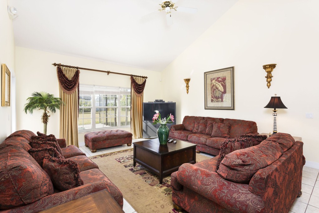 Spacious comfortable seating area with three sofas overlooking the pool deck