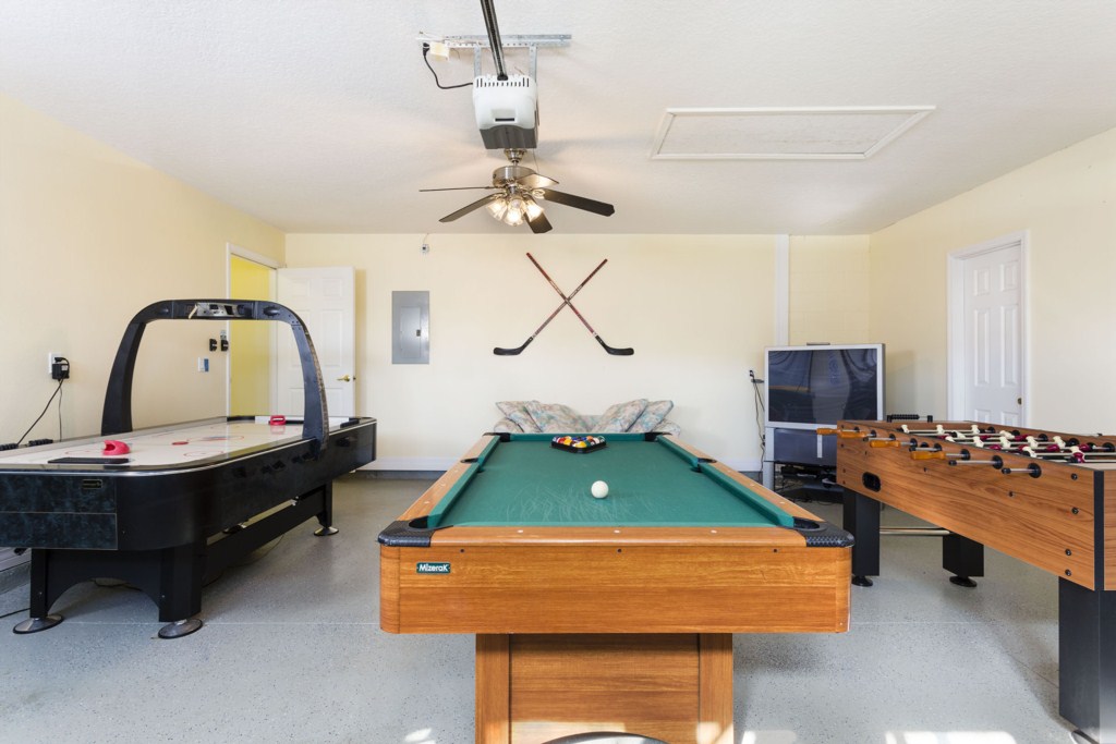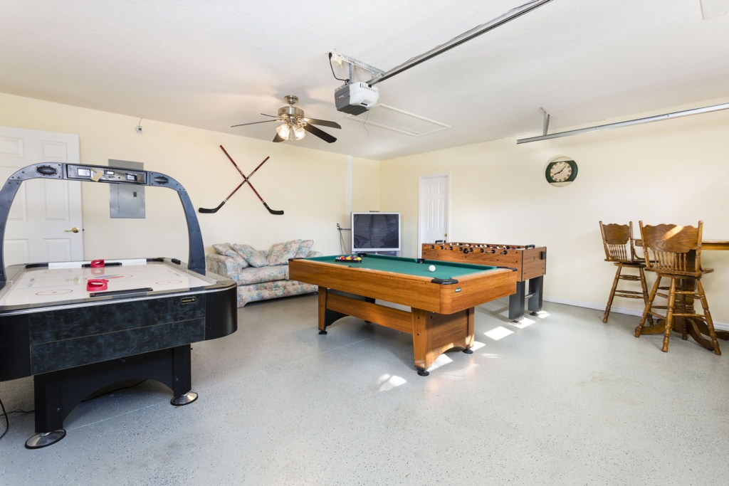 Games room has a pool, air hockey, and foosball table, large screen TV with games console, a sofa, and two seat high top table