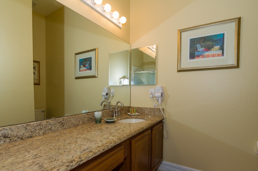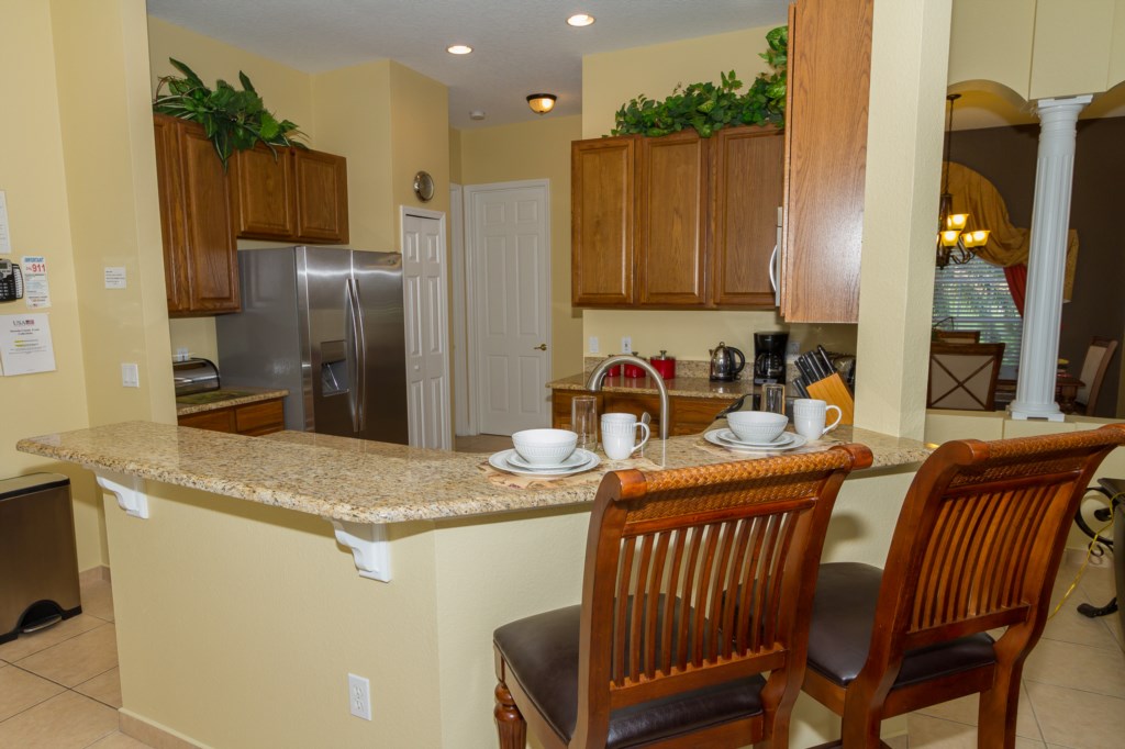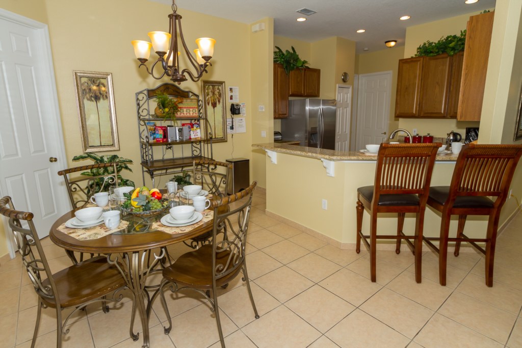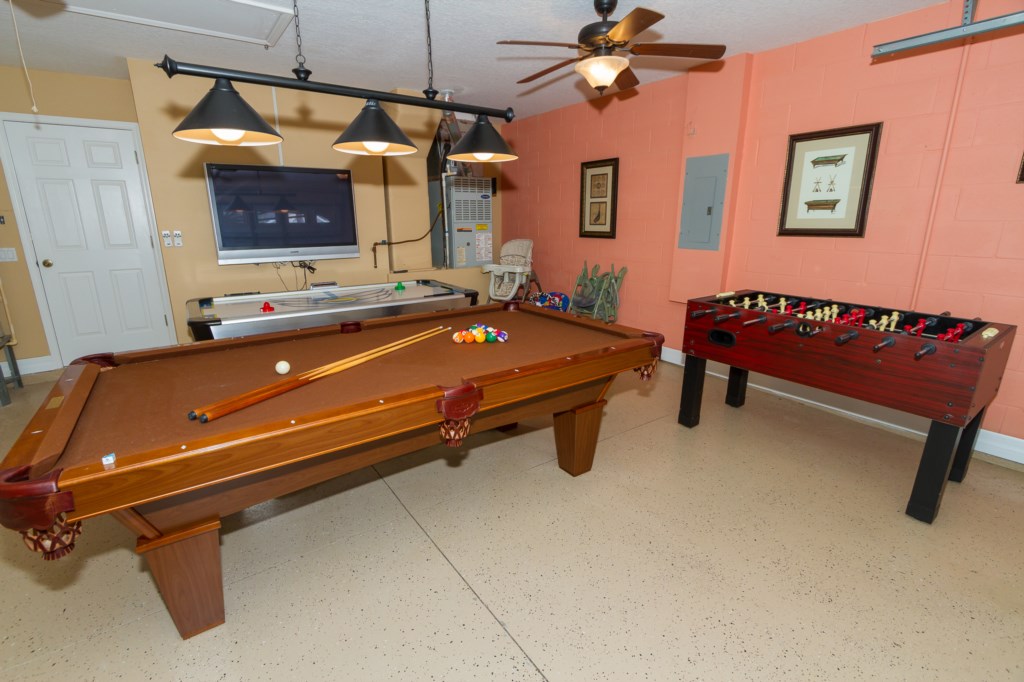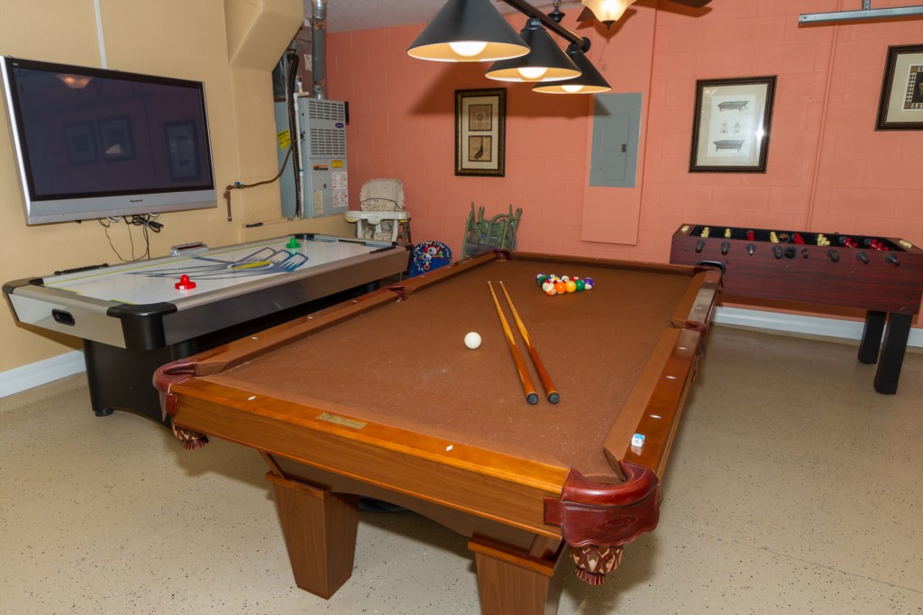 Enter through the front door and you’ll immediately notice the pillars and tiled floors which work together to make this place feel grand. There’s a formal living room on your left and a formal dining area on your right. As you walker deeper into the villa, you’ll enter the informal living room, which has two cushy leather sofas and a large flat screen TV. This is the perfect place to kick back and relax after a long day at the parks. The living room also has a patio door that leads into the pool area. Cooking enthusiasts will love the fully-equipped kitchen. It has plenty of workspace, stainless steel appliances, granite countertops, a breakfast bar with seating for two, and a breakfast nook with seating for 4. You’ll really enjoy cooking in this kitchen. Think you’ll have a laundry day? No problem. This villa comes with a front-loading washer and dryer. The best two things about this villa? The pool and the games room. The games room is in the converted garage and has pool, foosball, air hockey, and a PlayStation 2 games console. With so much fun to be had, you’ll spend hours playing in here. The screened-in pool has a large pool, spa, sun loungers, patio chairs, and a covered lanai.