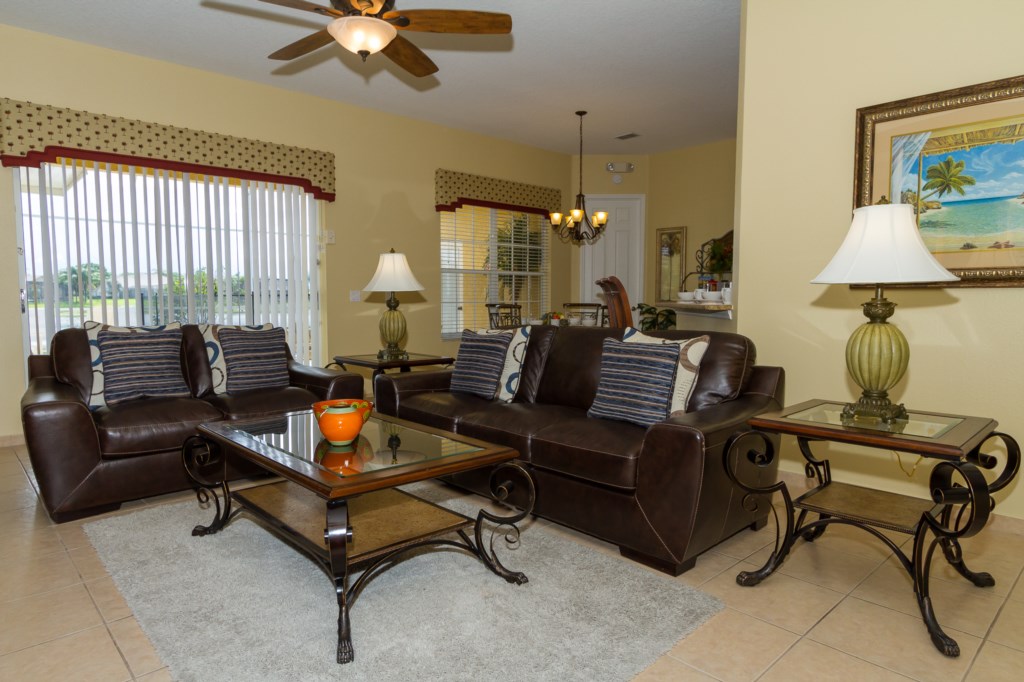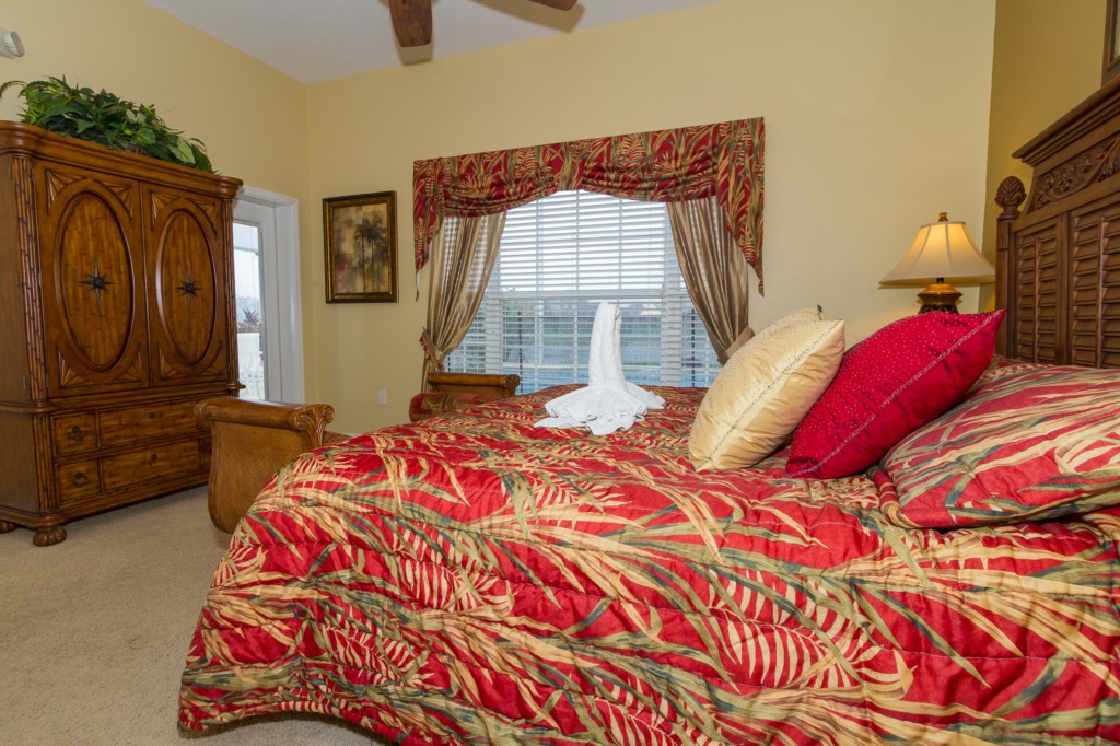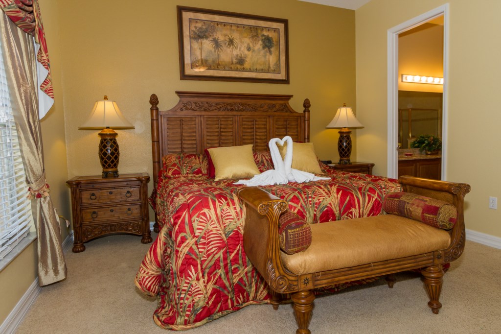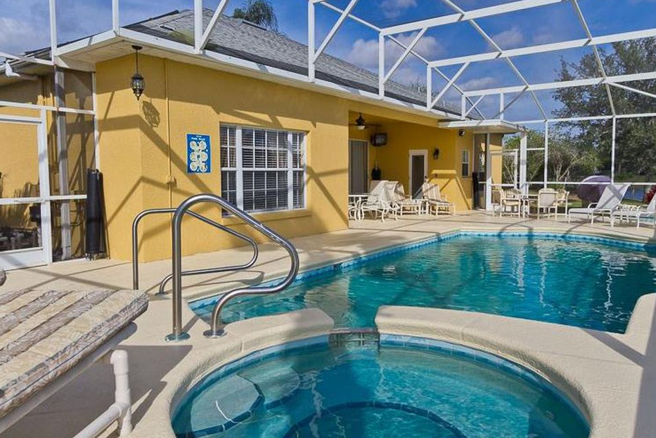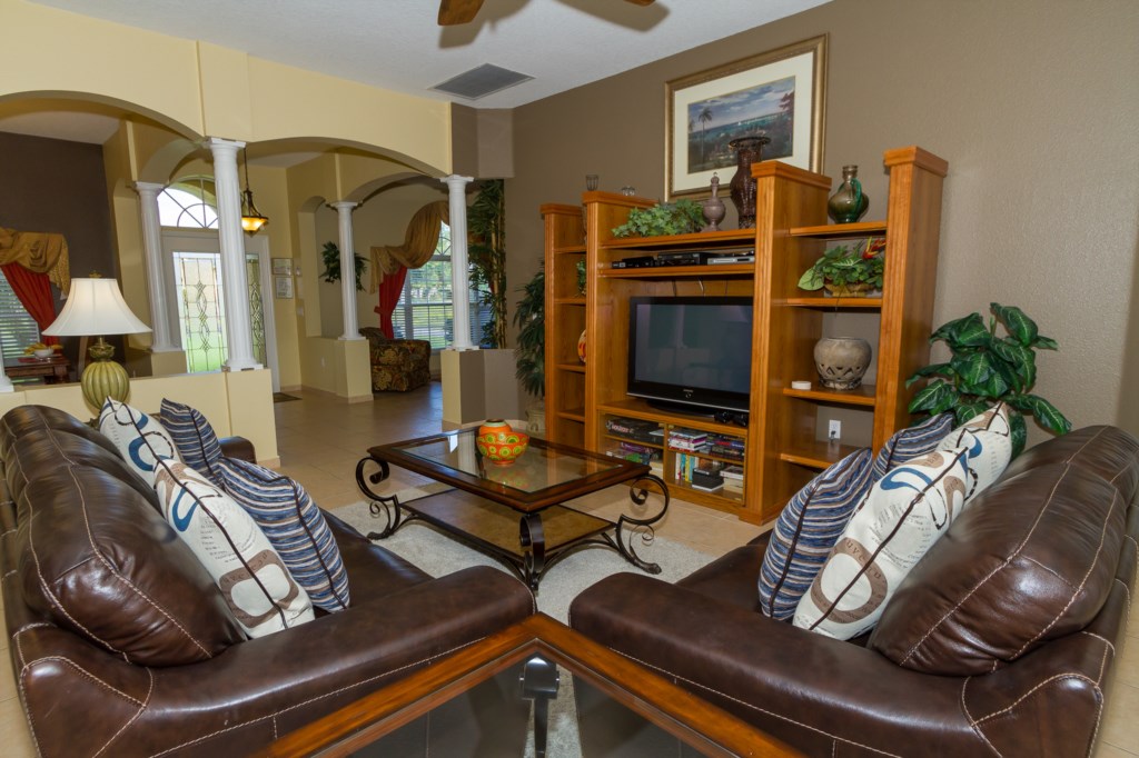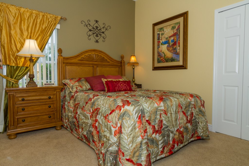 Enter through the front door and you’ll immediately notice the pillars and tiled floors which work together to make this place feel grand. There’s a formal living room on your left and a formal dining area on your right. As you walker deeper into the villa, you’ll enter the informal living room, which has two cushy leather sofas and a large flat screen TV. This is the perfect place to kick back and relax after a long day at the parks. The living room also has a patio door that leads into the pool area. Cooking enthusiasts will love the fully-equipped kitchen. It has plenty of workspace, stainless steel appliances, granite countertops, a breakfast bar with seating for two, and a breakfast nook with seating for 4. You’ll really enjoy cooking in this kitchen. Think you’ll have a laundry day? No problem. This villa comes with a front-loading washer and dryer. The best two things about this villa? The pool and the games room. The games room is in the converted garage and has pool, foosball, air hockey, and a PlayStation 2 games console. With so much fun to be had, you’ll spend hours playing in here. The screened-in pool has a large pool, spa, sun loungers, patio chairs, and a covered lanai.