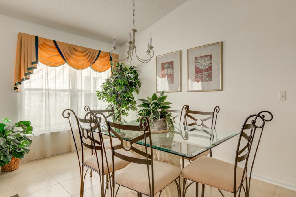 With 2 living areas, there’s a lot of space to relax in. The first living room has a lot of natural light and it has been tastefully decorated with more formal furnishings that include 2 sofas. The second living room has a more homely feel to it, and this too has a lot of light due to its large bay windows. With 3 comfy sofas, a small wooden coffee table, and various side tables, there’s plenty of room for everyone to relax here if they want to. If you wish to watch TV, there’s a large flat screen TV, a DVD player and a VCR player, all of which are fitted into a large entertainment cabinet which also boasts a range of DVDs to choose from. Guests will be able to dine in style at the wrought iron formal dining suite. There’s a sense of elegance with the regal looking drapes and the overhanging chandelier.