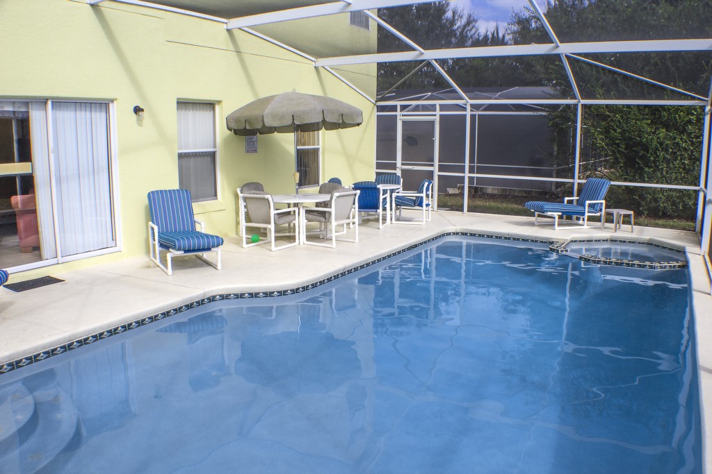 Guests love the pool area, which is screened to add privacy and safety. The pool has a heatable electric blanket and also an adjoining Jacuzzi. The concrete patio area is spacious and there are a few padded sun loungers to relax on or alternatively, you can get some shade under the umbrella.
