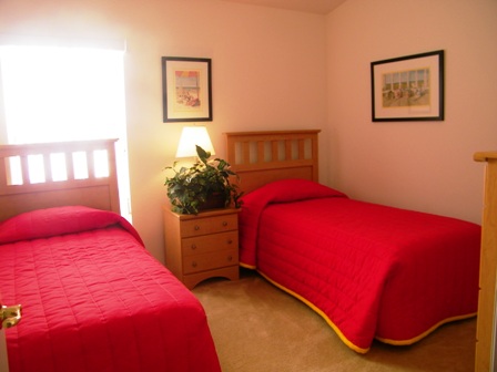 The open plan kitchen and dining room are comfortable and it provides guests with the option of eating their meal at the dining room table or grabbing a quick bit to eat at the breakfast nook. The living room with its large bay windows and doors attract the warm sunlight into this well laid out room that’s equipped with comfy sofas and a flat screen TV.