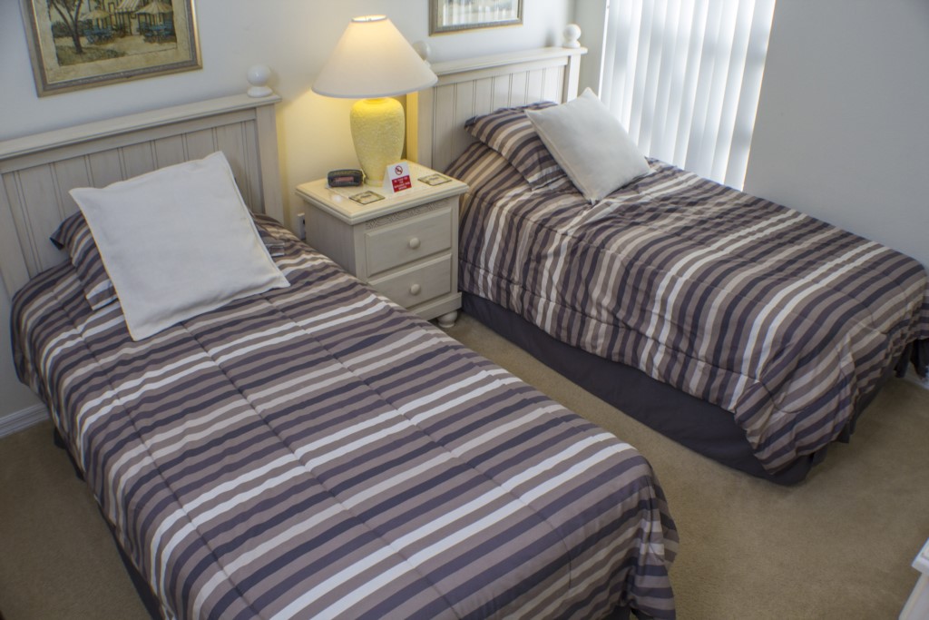 The master bedroom with large windows is simply designed and follows the minimalistic approach. It has a comfortable king-size bed, bedside furniture, a large closet and the luxury of having its own en-suite bathroom. The bathroom’s large and comfortable; and it easily accommodates 2 guests with a double vanity, a deep bathtub, and a separate shower and toilet. Similar in design, the second master bedroom has a queen sized bed. It also boasts its own en-suite bathroom with a single vanity and large closet space. The 2 twin bedrooms are brightly colored. The soft beds are welcoming and each room has its own TV set.