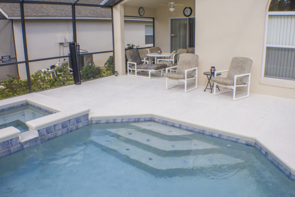 You and your family will love the outdoor patio area. You’ll have your own private screened pool with adjoining Jacuzzi. The screening will give you the privacy you need, but at the same time you’ll be able to enjoy the green views beyond. The covered lanai area has a small outdoor dining area that seats 4. Or, if you want to catch a few rays and soak up the sun, you can relax on one of the sun loungers.