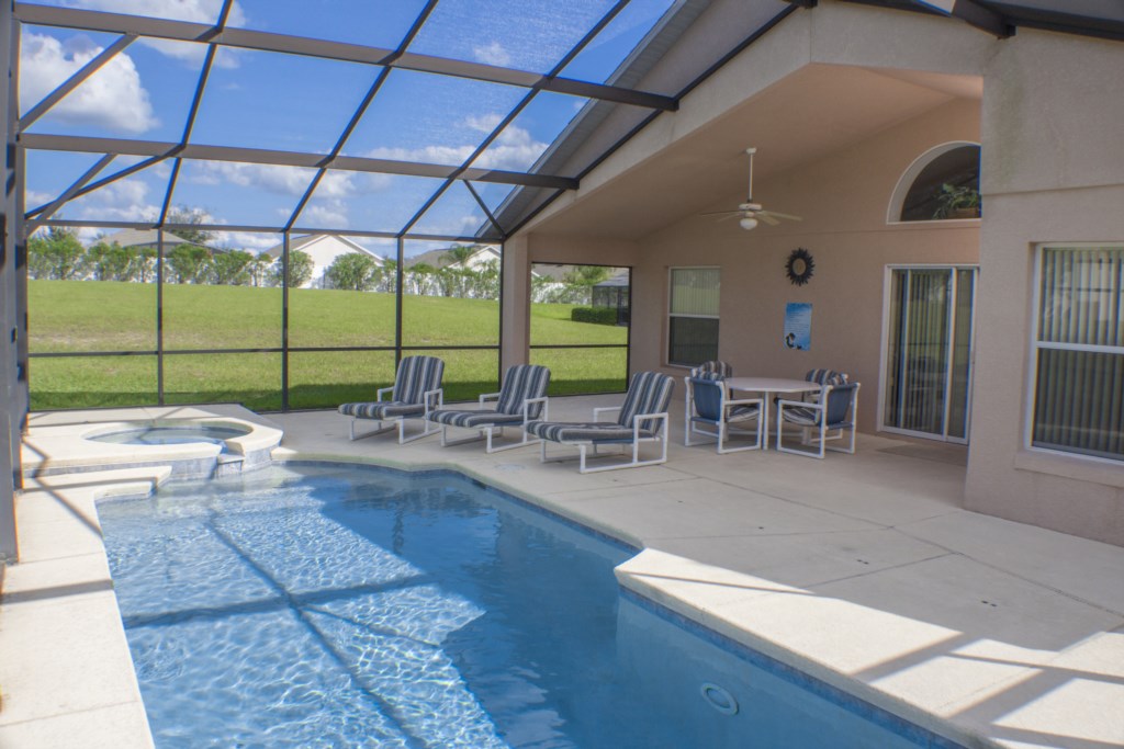 The large paved patio area is a favorite place for all guests. It wraps around the side of the house and surrounds the lagoon shaped pool with adjoining outdoor bath. There’s plenty of space to relax out of the sun under the covered lanai and the owners of the home have aptly decorated the porch area with a patio set consisting of a table and 4 chairs and 3 cushioned sun loungers.