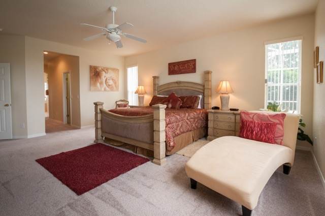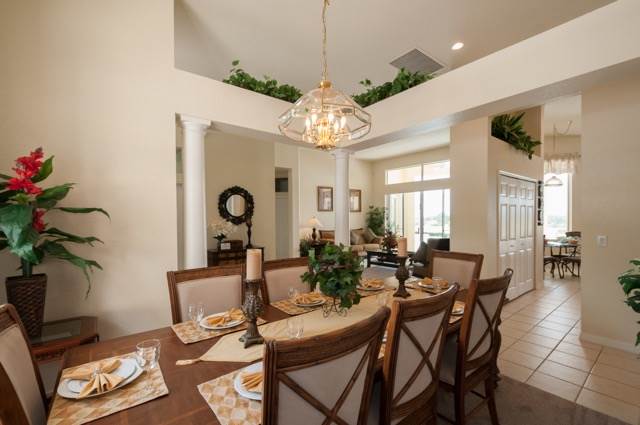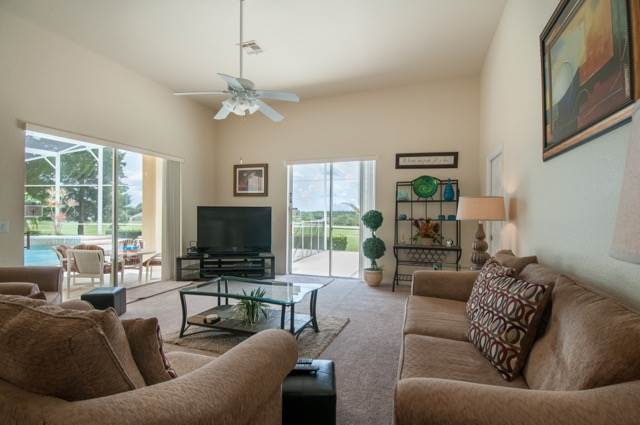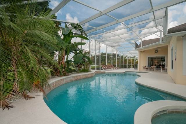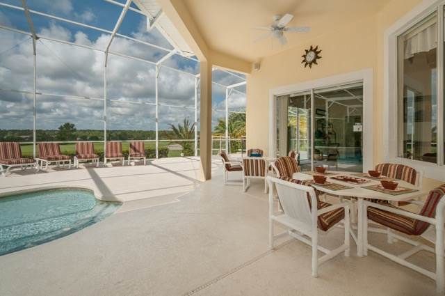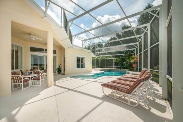 The property is situated at the top of a cul-de-sac, and it is not overlooked on either side. It has a panoramic view from the rear looking down on the green of the 17th hole, so you too can enjoy a beautiful view of the course at any time of the day or watch the stunning sunset in the evening! To say that the pool deck is extended is an absolute understatement! We have a large area at one end that is ideal for sun bathing away from the pool. We have a large covered lanai which is ideal for when the sun is just too hot! The pool itself is free form and larger than the norm! If needed, the pool can be heated by electric topped up by gas for an additional fee. Within the deck, we also have a small area of trees and shrubs so the park has come into the pool area.