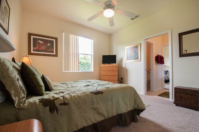 The large master bedroom has walk in closet and huge bathroom with two wash basins, shower and separate bath tub. The room has a king size bed, dresser and night stands as well as an easy chair and day bed for lounging on, and a 42 inch LCD wall mounted TV. You have access from the master bedroom directly to the pool deck. Off the hallway that joins the master bedroom to it's bathroom there is access to a twin bedroom - ideal for families with small children they want to keep close to hand!