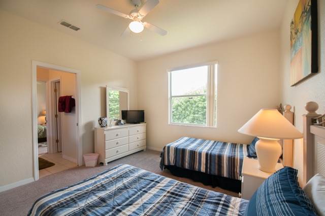 The home has 2 further bedrooms that share a 'jack and jill' bathroom. The bedrooms have one full bed and 2 twin beds.