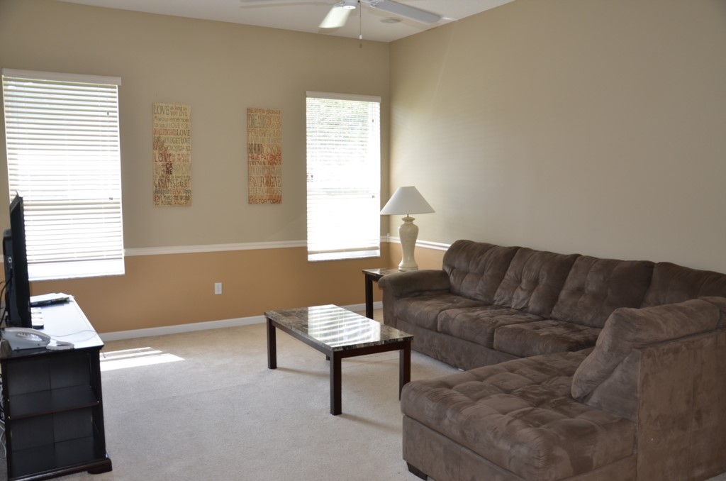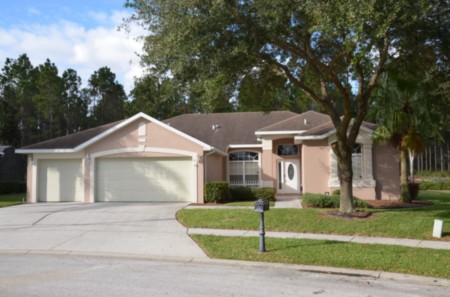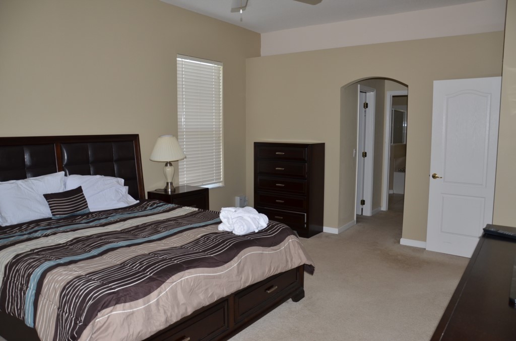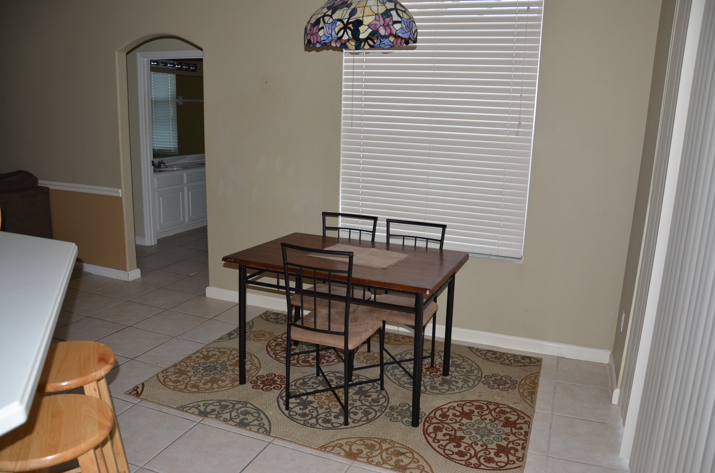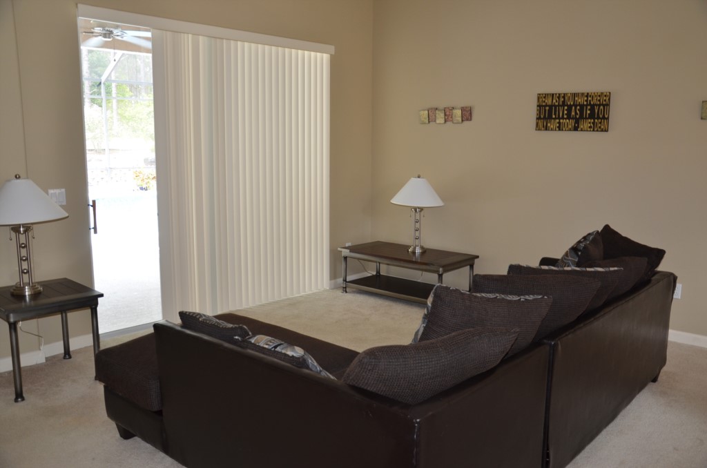 This four bed, three bath private pool home is not overlooked and has a conservation view and large back yard. Through the entrance hal you will find the dining area and the first of two living roms. The master with EnSuite is off to the right and away from all other bedrooms. Down the hallway is a bathroom and a utility room and there are two bedrooms both with two twin beds. The open plan kitchen has a breakfast bar and a separate breakfast are which leads to the second large living room with flat screen TV. From this room a separate anexe houses the queen bedroom and another EnSuite. A doorway leads to the oversize pool deck with outside furniture and a very spacious swimming pool. The whole area is protected with a pool cage and insect mesh so the evening barbecues do not get interrupted by unwanted bug guests.