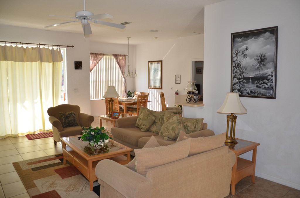 This beautiful 4 bed, 3 bath home. The home is located on the Highlands Reserve sub division which has its own golf course and club house.Located off Highway 27 near the intersection with I-4 this is a great location for the major theme parks and convenient links to the beach. All well known shopping mall's are in close proximity. Just next to the sub division is a shopping area that includes a major supermarket along with various restaurants and bars, so there's no need to venture too far away if you don't want to!The deck benefits from the sun for most of the day. This quiet, extended deck provides a perfect space to relax after busy days at the theme parks, on the golf course or at the many shopping centers. The home has a fully equipped kitchen that includes cooker, fridge freezer, dishwasher, microwave, washer and dryer. All kitchen utensils, crockery, cutlery and pots and pans are included. The kitchen leads into the dining area which overlooks the pool and golf course. The large, tiled living room with cathedral ceilings provides a relaxing space in which to enjoy the large flat screen TV. The home benefits from free long distance calls and WiFi. The master bedroom has a Queen size bed and features a huge en suite bathroom with shower and separate bath. The second bedroom has a Queen size bed, with the third and fourth bedroom having 2 Twin beds in each. The family bathroom, located between these two bedrooms has a large shower and modern basin. We hope you will enjoy a relaxing stay at our home away from home!
