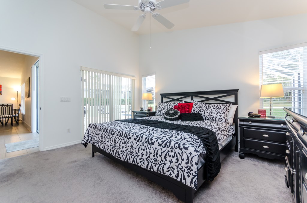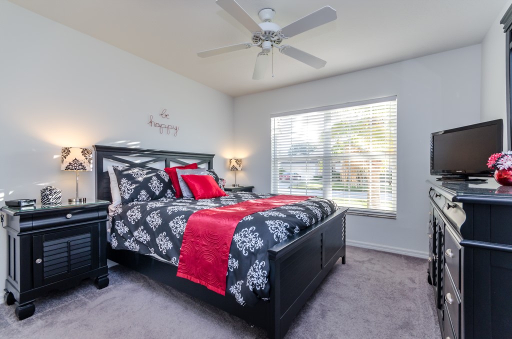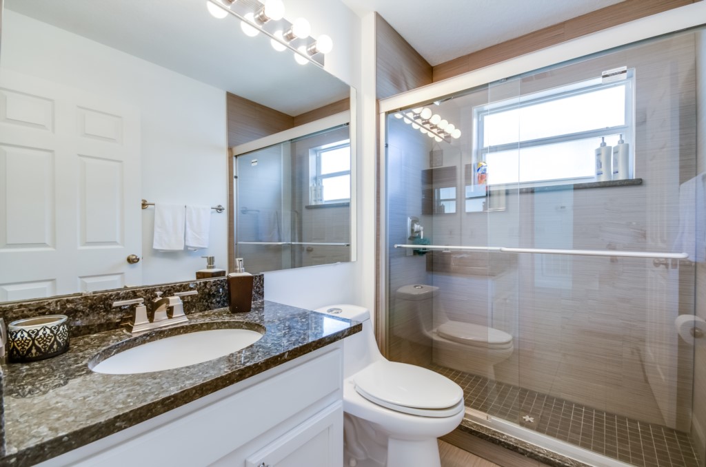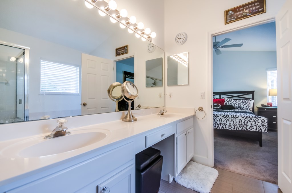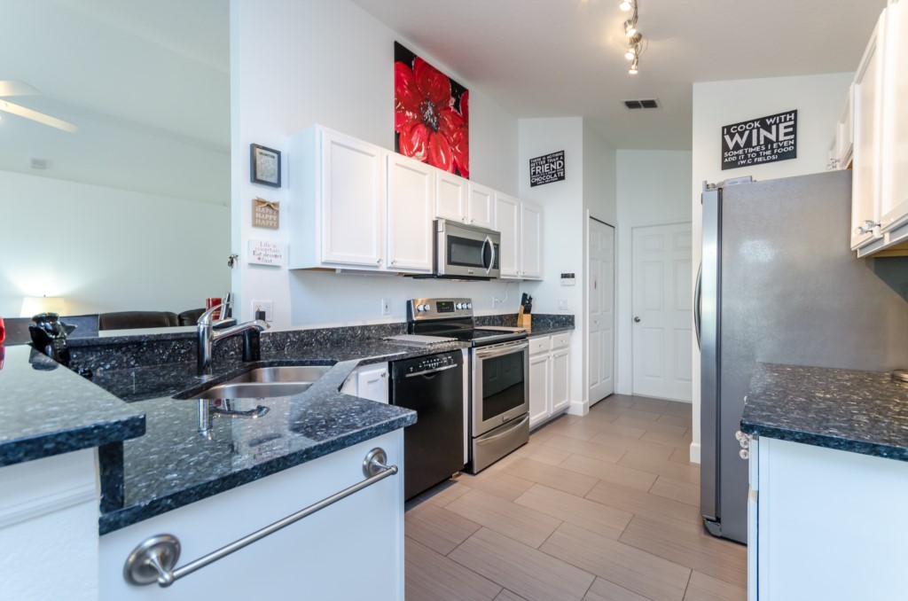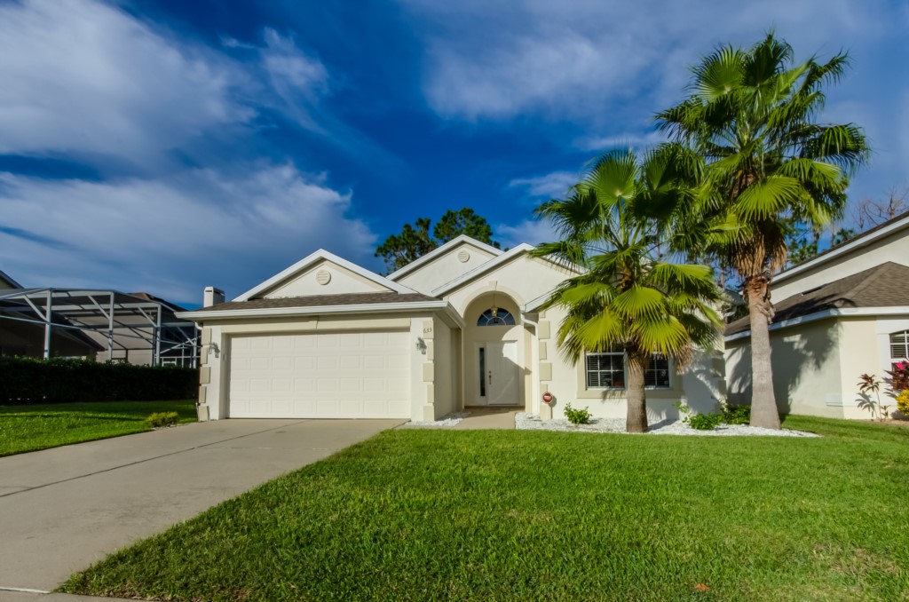 Stunning 3 bed 2 bath villa with excellent, private pool and spa. This modern updated property has all the amendites and upgrade you could want. Wonderful outdoor area with large table seating 6 in covered lanai with 2 ceiling fans to keep you cool. Or relax all day in the sun on the sun loungers and recharge the batteries before heading back to the theme parks .There is a pool alarm on the patio doors to go out to the pool deck to keep the little ones safe. Dip in the pool to cool off, then relax in the spa under the stars in the evenings. Suits smaller families, couples, golfers, on golf community with large communal pool, tennis courts and play area. Close to local shops and restaurants. Huge king bed in master bedroom with ensuite having garden bath, large shower, his and hers sinks and toilet, hair drier and straighteners, large wardrobe and patio doors to pool deck, queen bed in 2nd bedroom, large wardrobe, twin beds in 3rd bedroom, with large wardrobe containing , shared bathroom between bedrooms 2 and 3 having is a upgraded walk in with shower , sink and toilet. Flatscreen TV's in two bedrooms as well as the lounge. Telephone, free WIFI. Lounge seating for 8 including 3 seater and 2 seater sofas . Breakfast nook with table for 6 plus 2 at breakfast bar, overlooking pool area. Modern fully equipped kitchen with upgraded appliances and granite worktops, Washer, drier, Ironing board, modern iron, clothes airers. All this and just 10 minutes from main gate of Walt Disney World! 25-30 mins from Universal and Sea World. Come to see us soon!