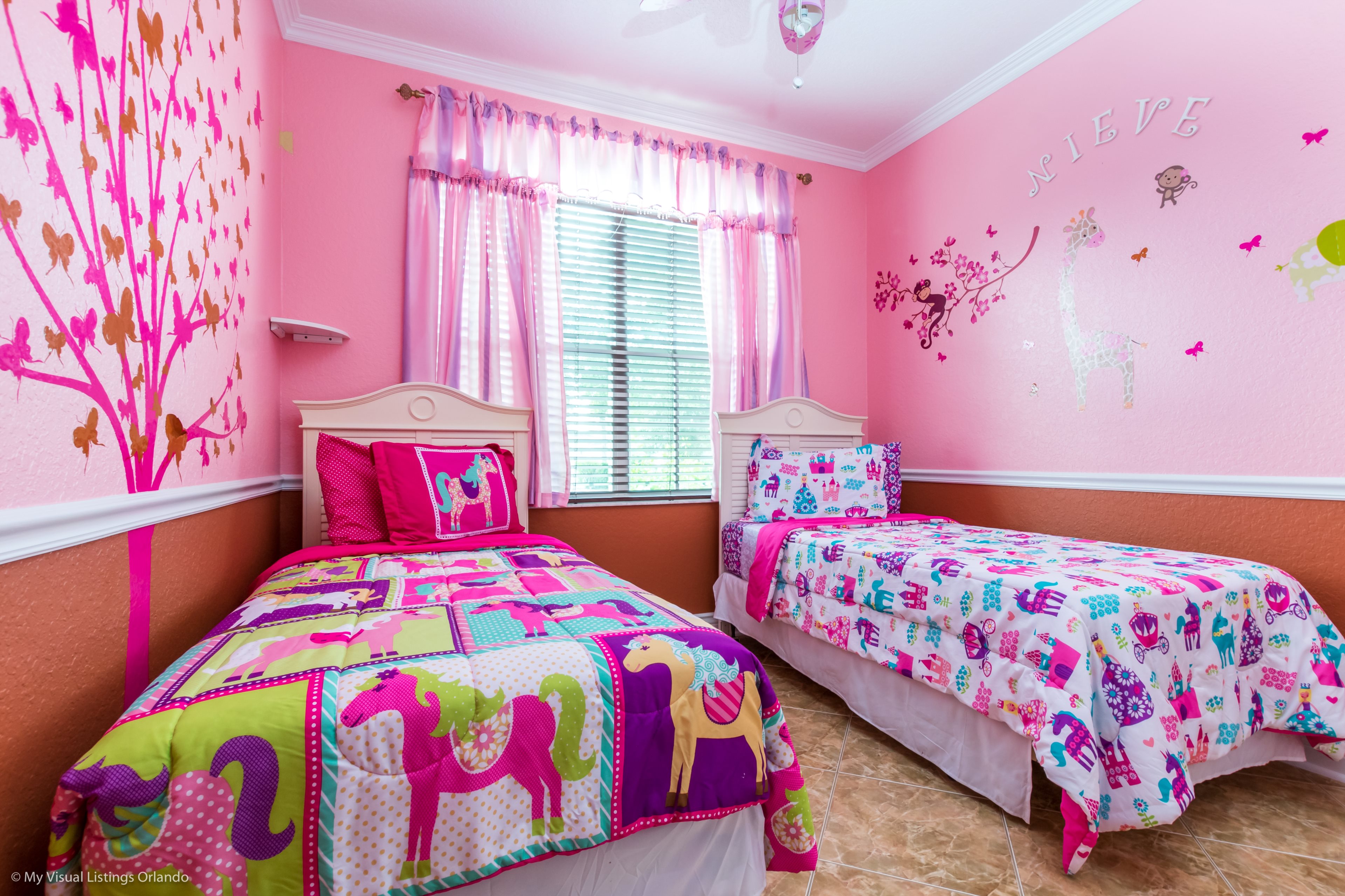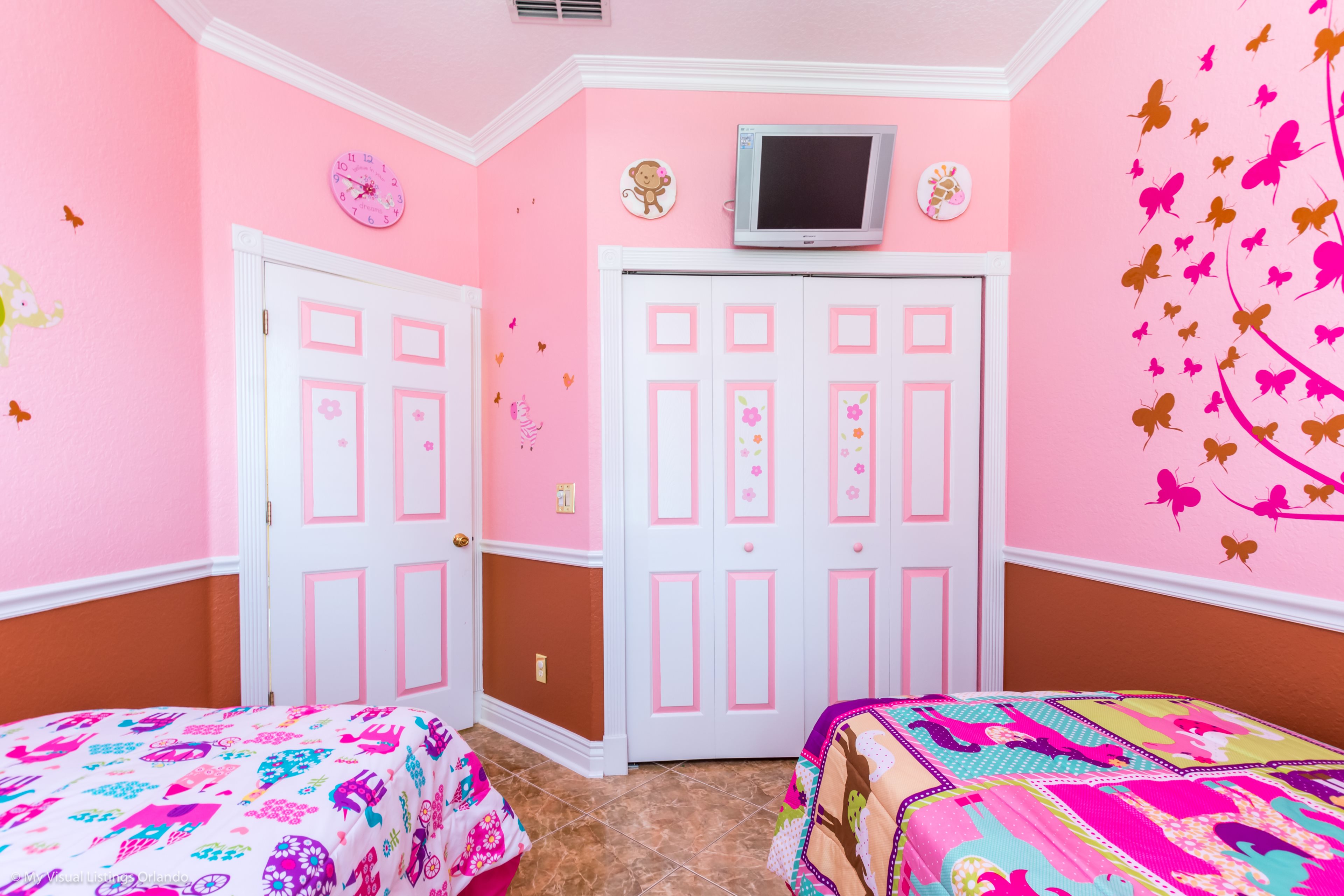 Spend quality time with your loved ones in the spacious family room, beautifully furnished with a sizable sectional sofa and floating shelves showcasing charming collectables. Find a show to watch on the flat-screen cable TV or keep the excitement going and utilize the DVD player to play your favorite Disney movie.