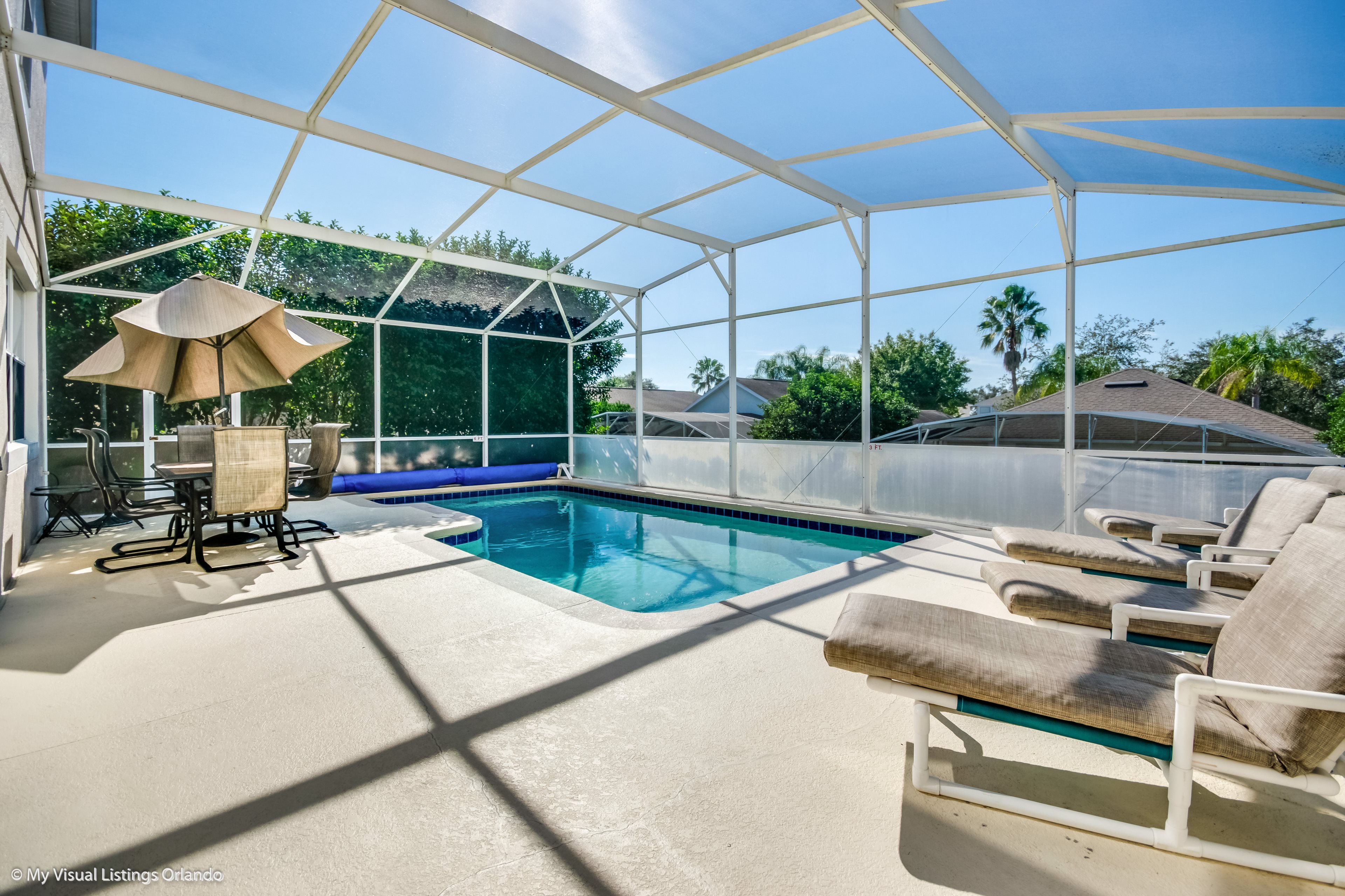 Dive into a state of relaxation as you kick off your shoes and sink into your private, screened-in swimming pool (heated for an additional fee). This west-facing outdoor space, furnished with lounge chairs and a shaded patio table, invites you to take full advantage of Florida’s year-round balmy temperatures.
