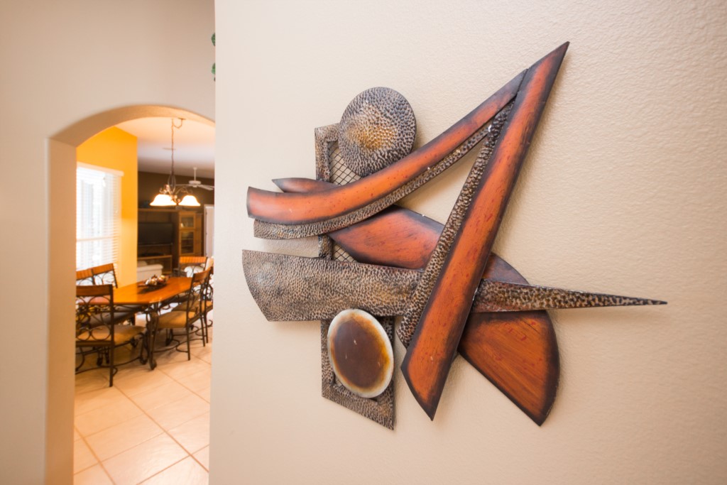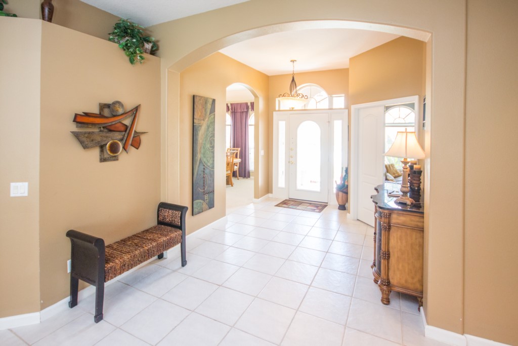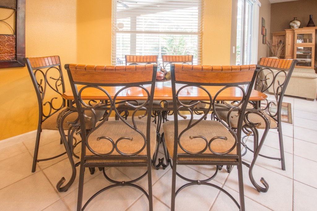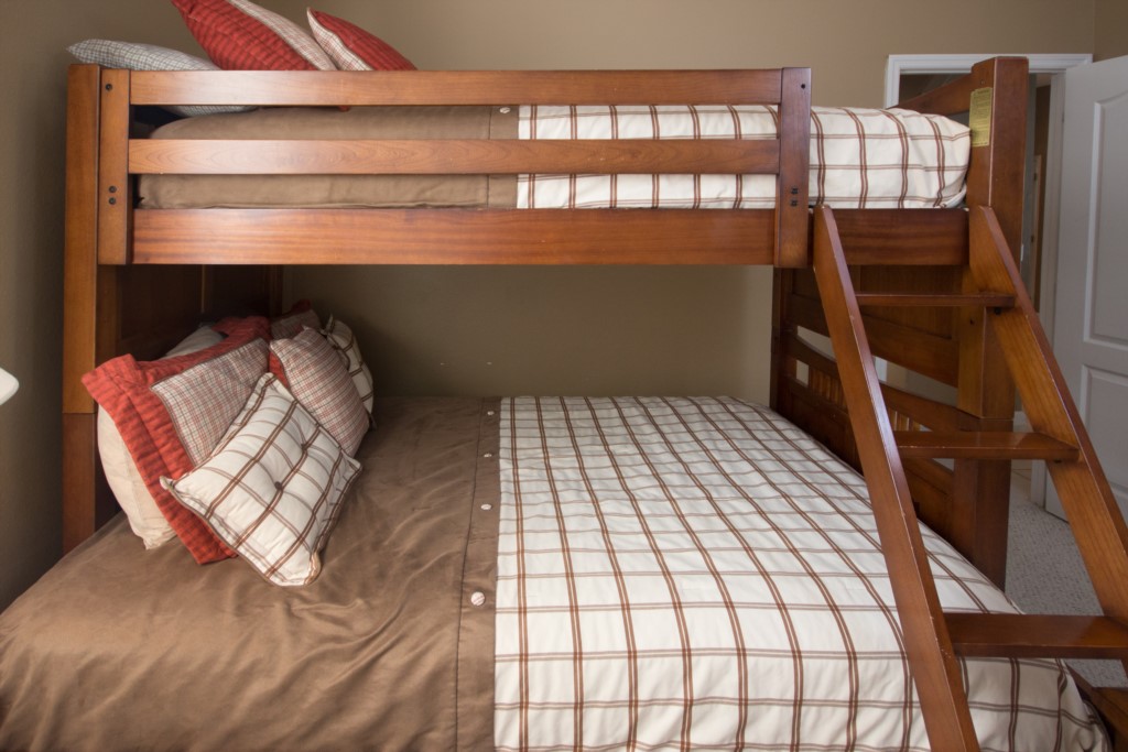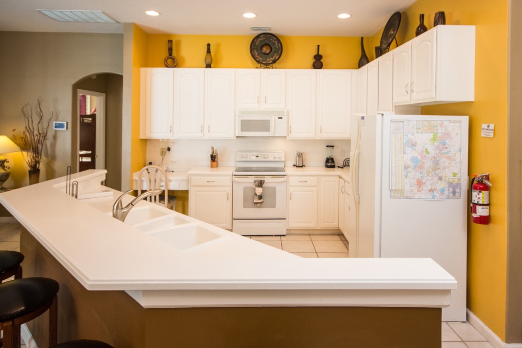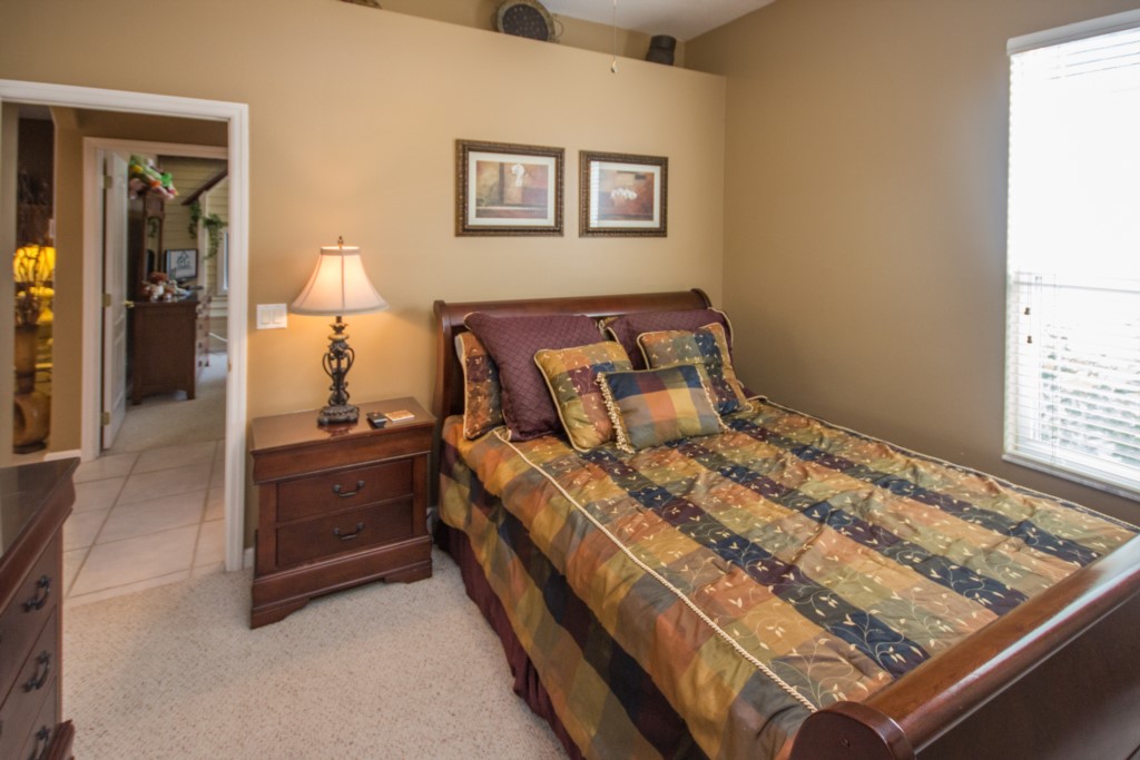 Are you part of a large group or family looking for somewhere to stay? This is place for you. This 5-bedroom, 3-bathroom, two-storey villa in Highlands Reserve sleeps up to twelve people! When you first enter the home, you step foot into a large foyer with tiled floor. To the immediate right is a large formal dining room. Walk forward, and you enter the formal living room, which has leather seating for 3 or more. This is the perfect place to socialize with others. Take a right and you enter the informal dining room / breakfast nook, which has seating for up to six people. Just off the dining area is the kitchen and informal living area. The kitchen comes with modern appliances, has plenty of countertop space, and is fully-equipped with all the kitchen utensils you would need prepare a meal. The two-tiered, central countertop acts as both workspace and as a breakfast bar with seating for two. The kitchen overlooks the informal living room, which has plenty of seating and a large flat screen TV. There is also a small, third living room /den with sleeper sofa and TV. With so many people staying under the same roof, there is bound to be a lot of laundry. Don’t worry. There is a full-size washer and dryer.
