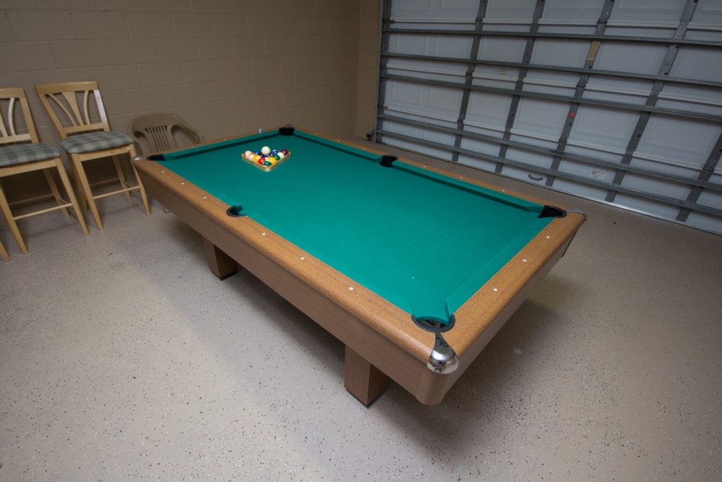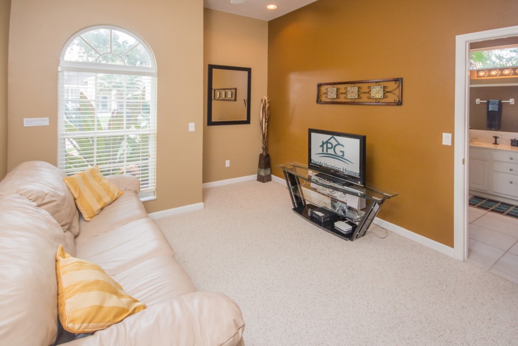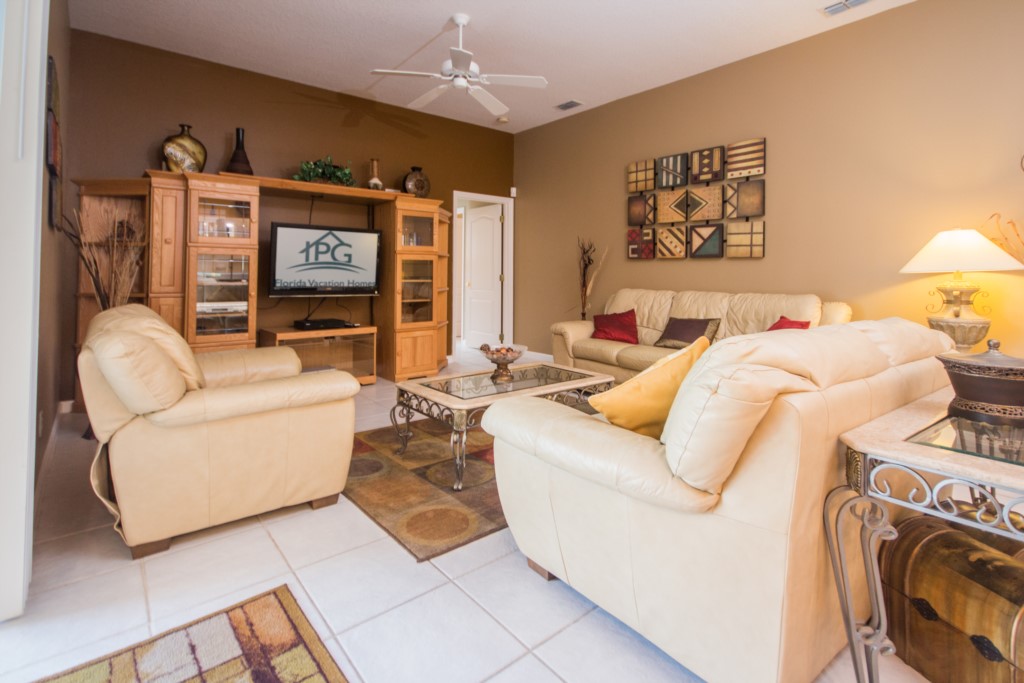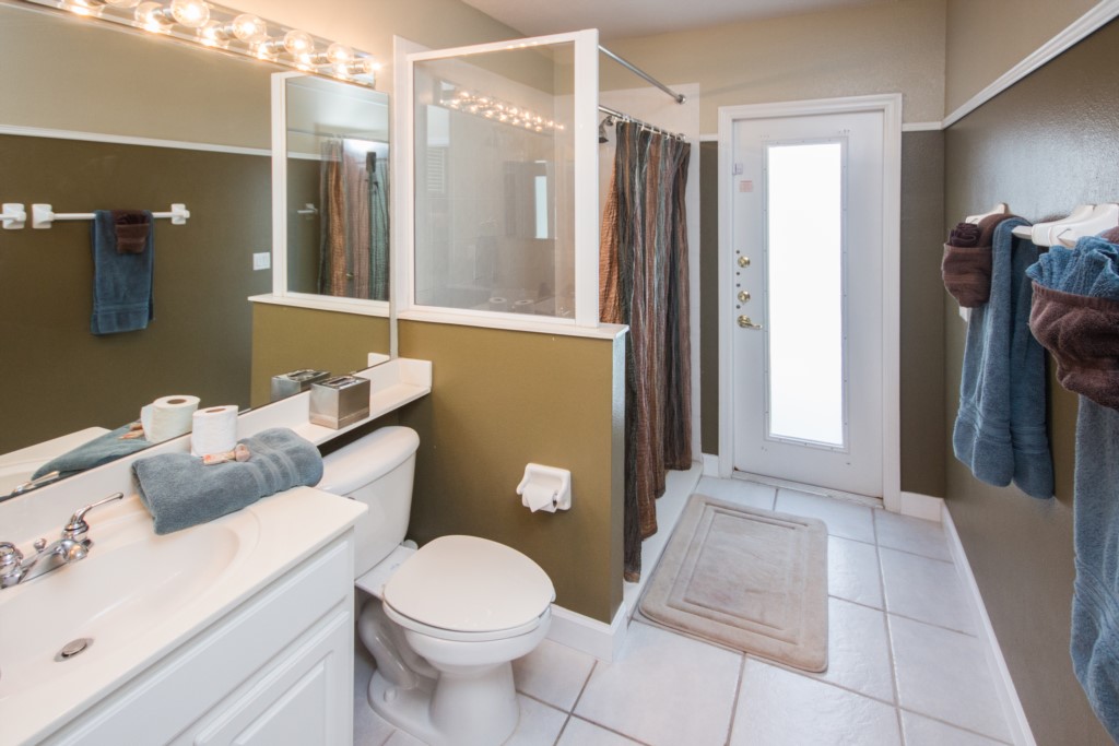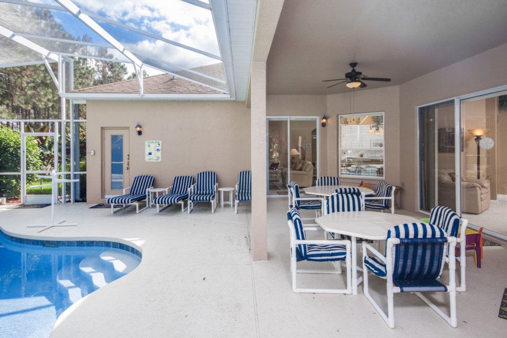 The master bedroom has a king-size bed, direct access to the pool deck, a walk-in-closet, and an en-suite bathroom. There is also another bedroom with a king-size bed, two bedrooms with queen-size beds and one bedroom with a bunk bed (a full bed and single bed). All bedroom have their own televisions. Wondering if this villa has a pool? It does! Outside at the back, you’ll find a pool with spa (optional heat available), covered lanai, and patio furniture.