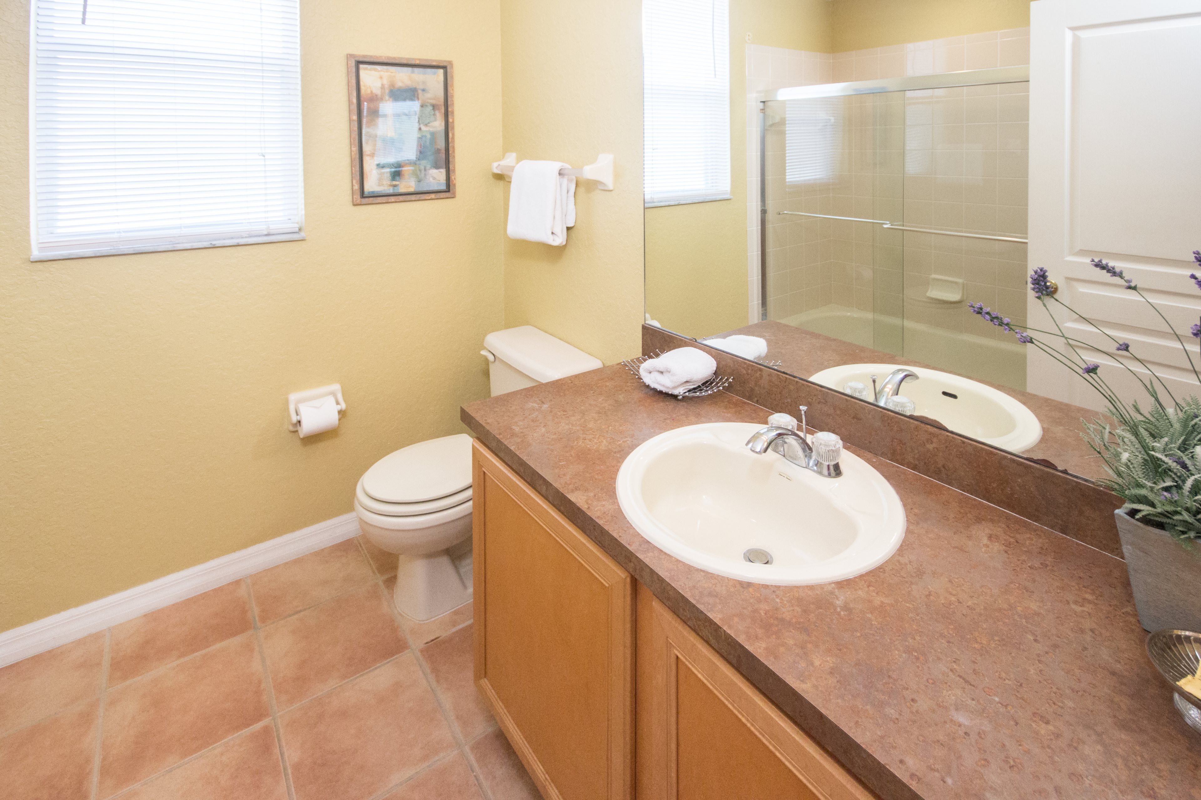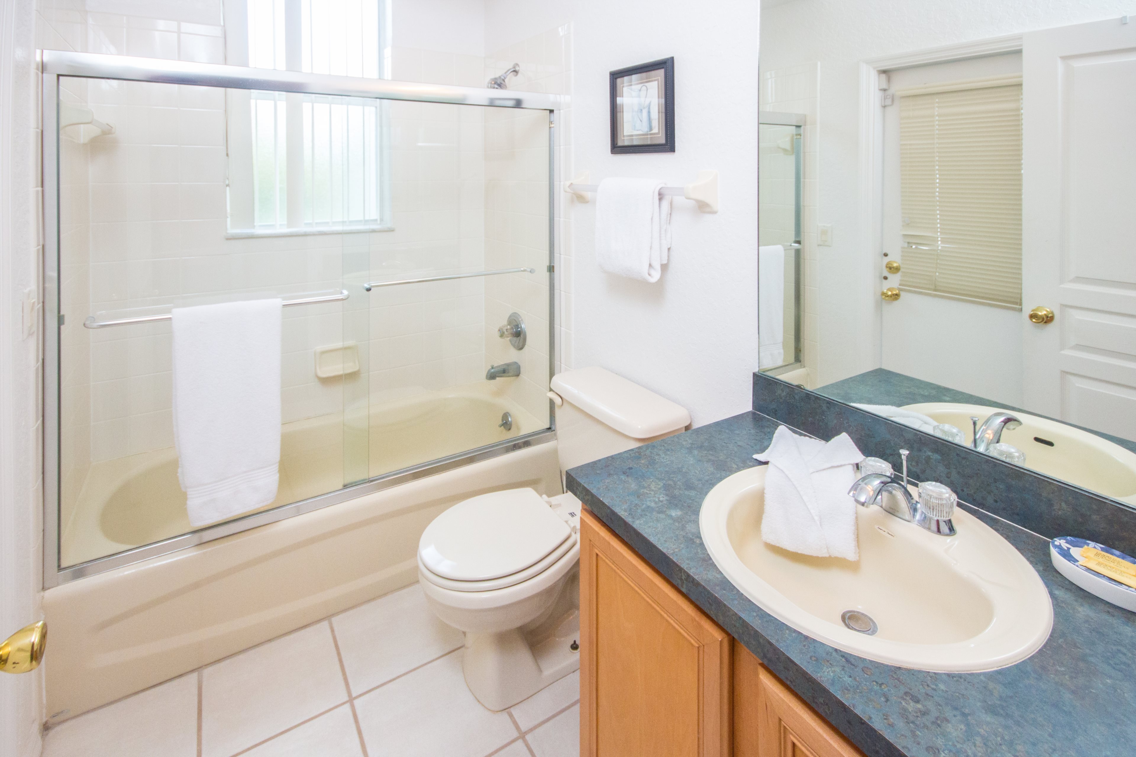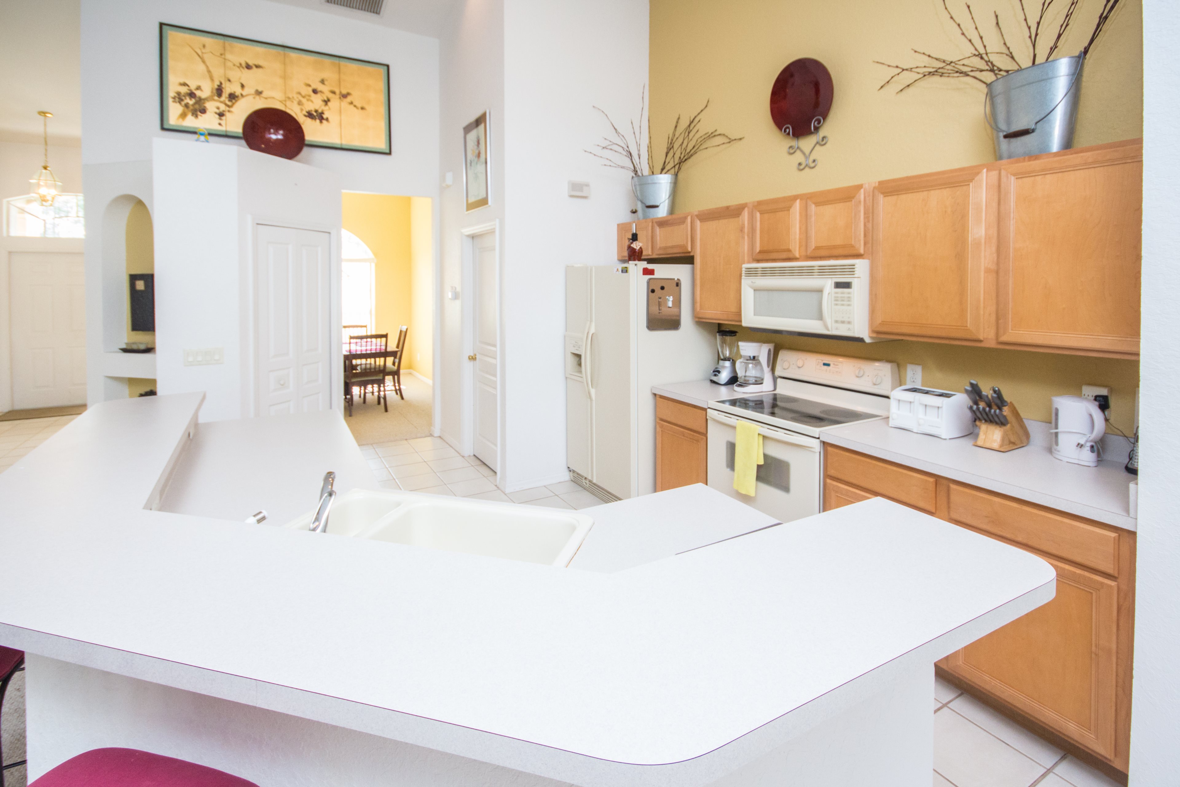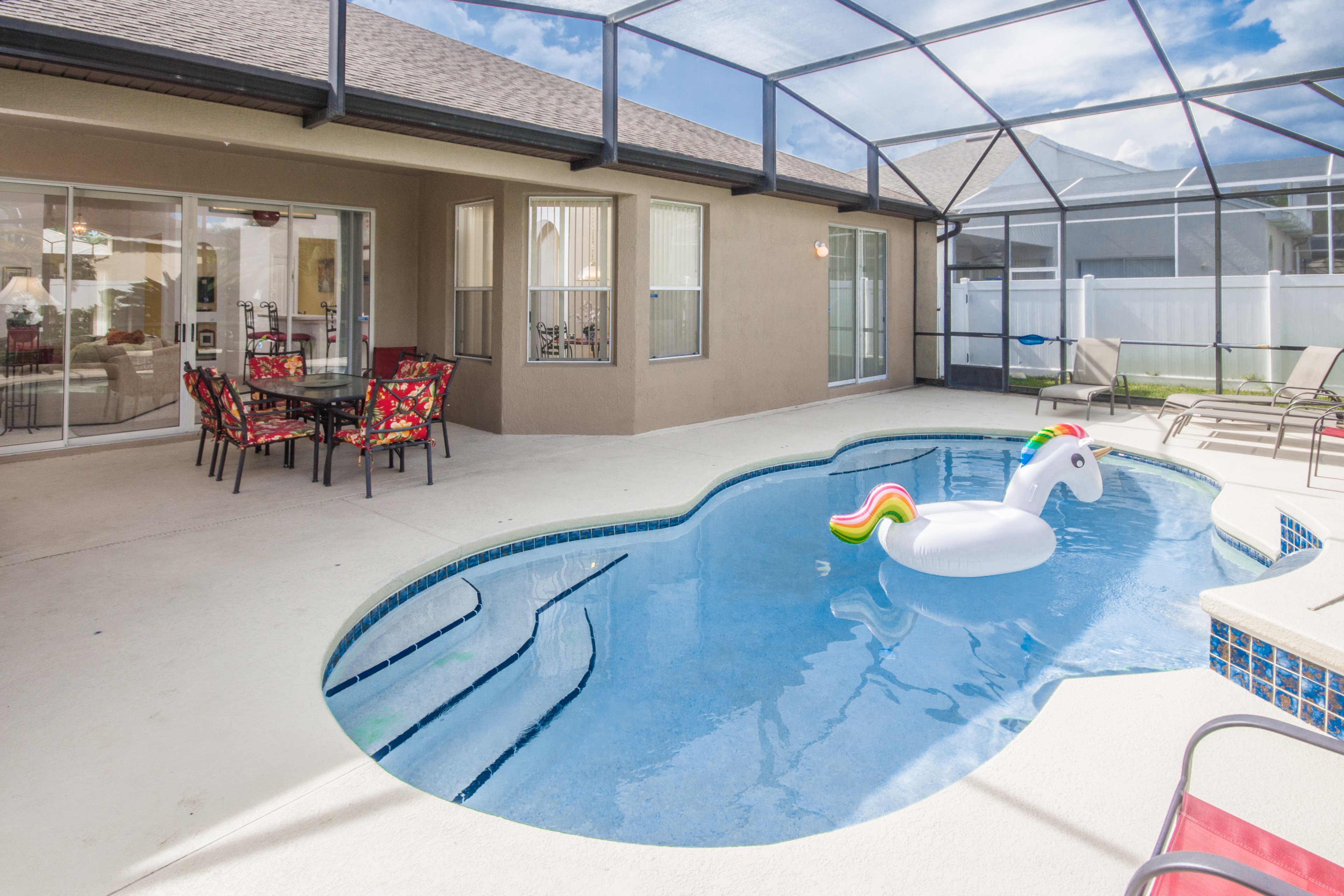 How does 4 bedrooms, 3 bathrooms, a games room, a private pool, and over 2,300 square feet of space sound to you? Thinking this might be a good fit? Read on. The exterior of the house is sharp, and well-manicured. As you enter the villa, you’ll notice the vaulted ceilings, which make all communal rooms appear large and airy. The first room you’ll notice is the living room. It has a very large, curved sectional sofa, which will seat eight or more people. It also has a large flat screen TV centered between two built-in bookshelves. This is the room that you’ll want to come to when you want to relax with a movie or book on the comfortable sofa after a long day out at the park. Behind the living room is the kitchen. It is large, open, and comes fully-equipped with all the utensils and equipment you could need to cook a meal. It also has plenty of countertop space, modern appliances, and a breakfast bar with seating for up to three. Need more room? There’s a breakfast nook just off to the side of the kitchen, and large formal dining suite with seating for up to 6 in the room next to the kitchen. There are 4 bedrooms. Bedroom number 1, the master bedroom, has a king-size bed and en-suite bathroom. Bedrooms two and three both have a queen-size bed. Bedroom four is ideal for the younger members of the family since it has two single beds. Don’t worry, all bedrooms come with their own TV, so no one should be fighting over the living room TV remote. I left the best for last: the pool and games room. The games room is in the converted garage, and it has a pool table and an air hockey table. The screened in pool area plays host to a variety of things to do. You can swim in the private pool, take a dip in the spa, catch some sun on the sun loungers, or, if you don’t want any more sun, you can retreat to the covered lanai where you can sit down and relax.