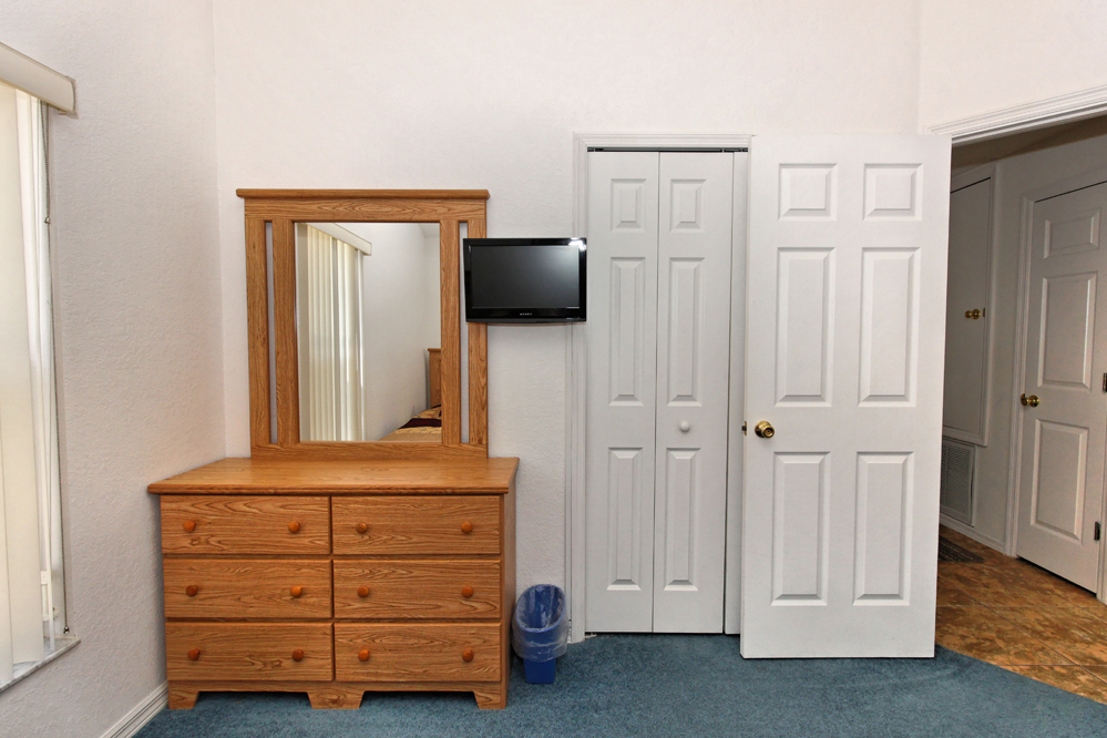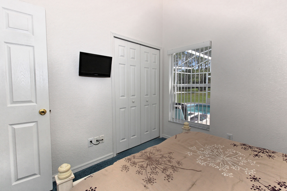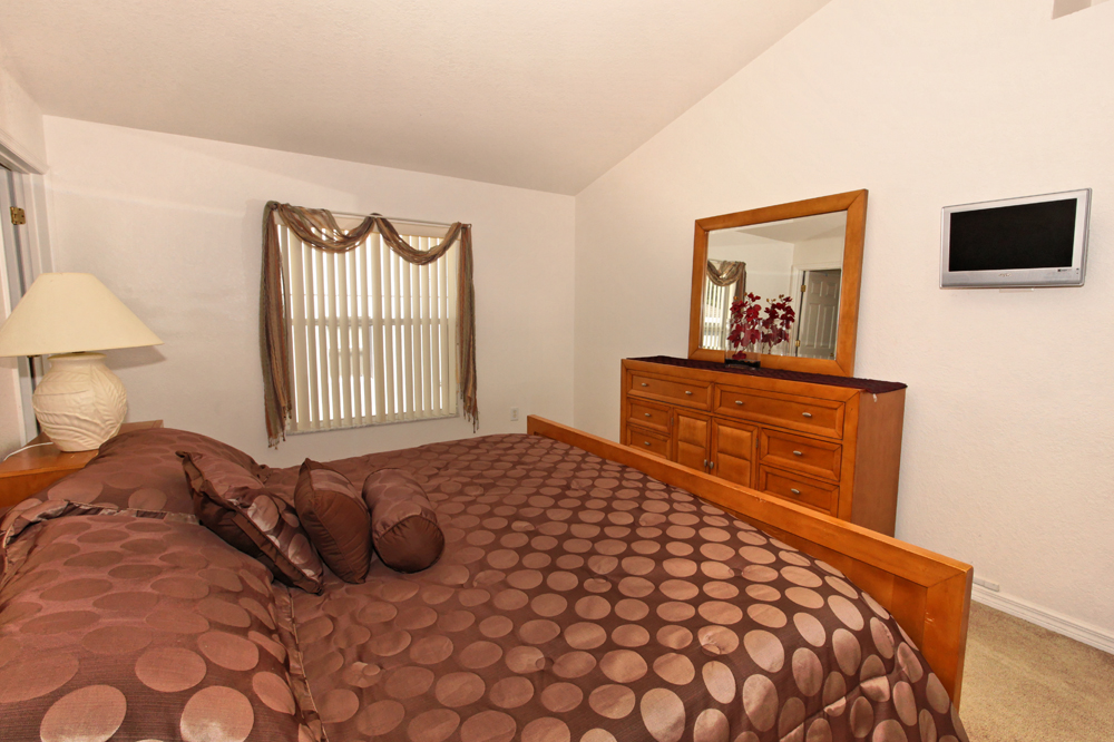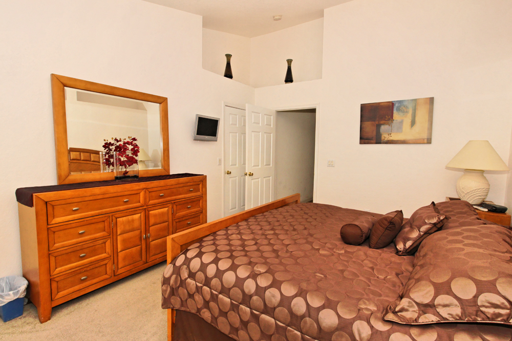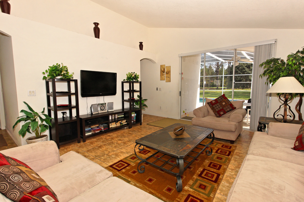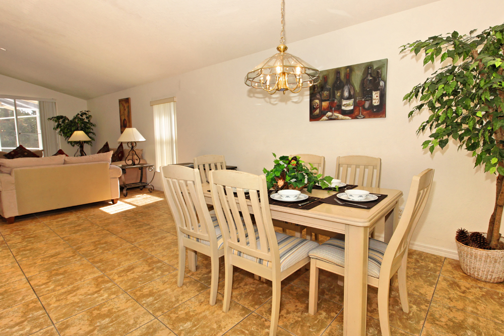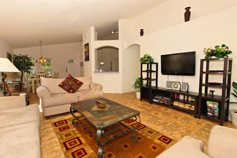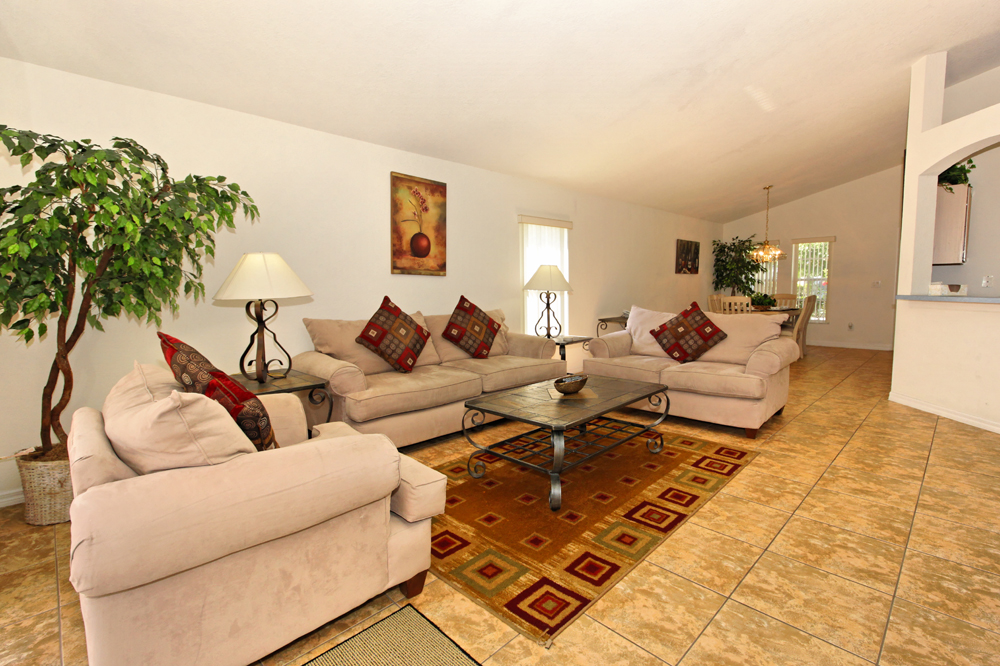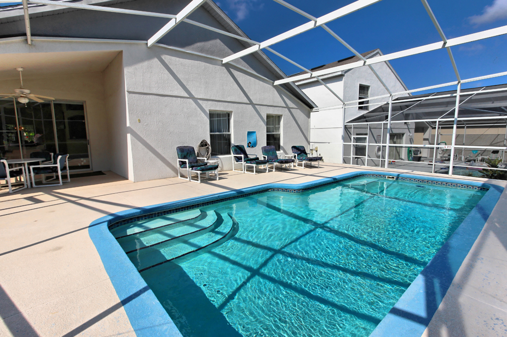 This beautiful single-storey home overlooks the golf course in the community of Highlands Reserve. You can lounge around the west facing swimming pool after a busy day sightseeing. This 4 bedroom home has 1 king-sized bedroom, 1 queen-sized bedroom, 2 bedrooms consisting of twin beds, 2 bathrooms, and a sofa sleeper to accommodate up to 8 people comfortably. The home has a games room, the pool deck has upgraded patio furniture (tubular chairs and loungers with cushions).